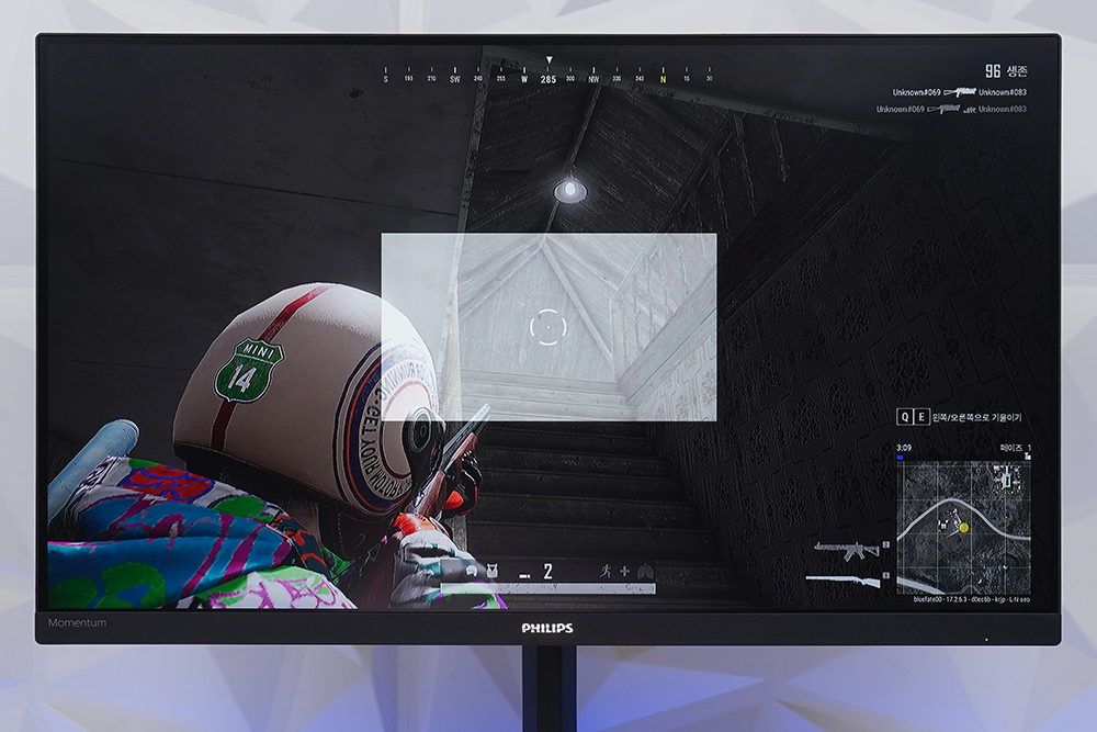 게임 설정에서는 조준선 기능을 켤 수 있는데요. 배틀그라운드와 같은 fps 게임을 플레이할 때 도움을 받을 수 있습니다. 그리고 스마트 프레임(SmartFrame) 기능을 이용하면 화면의 일부 영역을 강조할 수 있습니다.