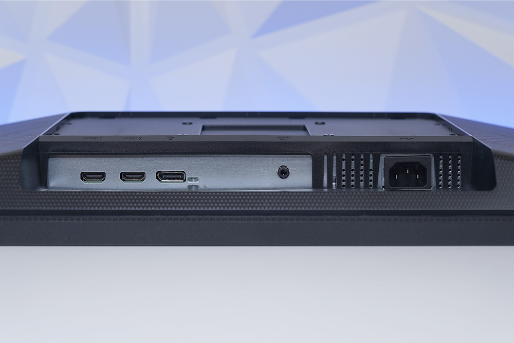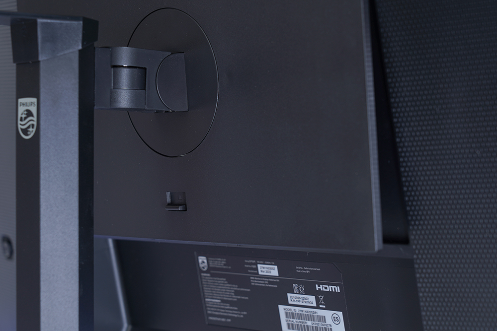 필립스 27M1N3200Z 게이밍 모니터의 뒷면은 깔끔한 스타일로 디자인되었습니다. 그리고 오른쪽에는 공개된 장소에 설치할 때 유용한 켄싱턴(Kensington) 도난 방지 잠금 장치가 배치되어 있습니다.