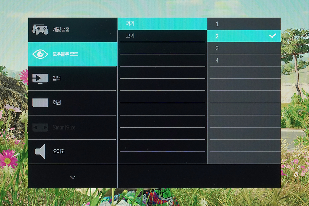 로우블루 모드를 선택하면 조금 더 눈이 편한 화면을 보여줍니다. 이름에서도 알 수 있듯이 파란색이 조금 빠지기 때문에 그래픽 작업을 하려는 분들은 해당 기능을 켜지 않는 것이 좋습니다.