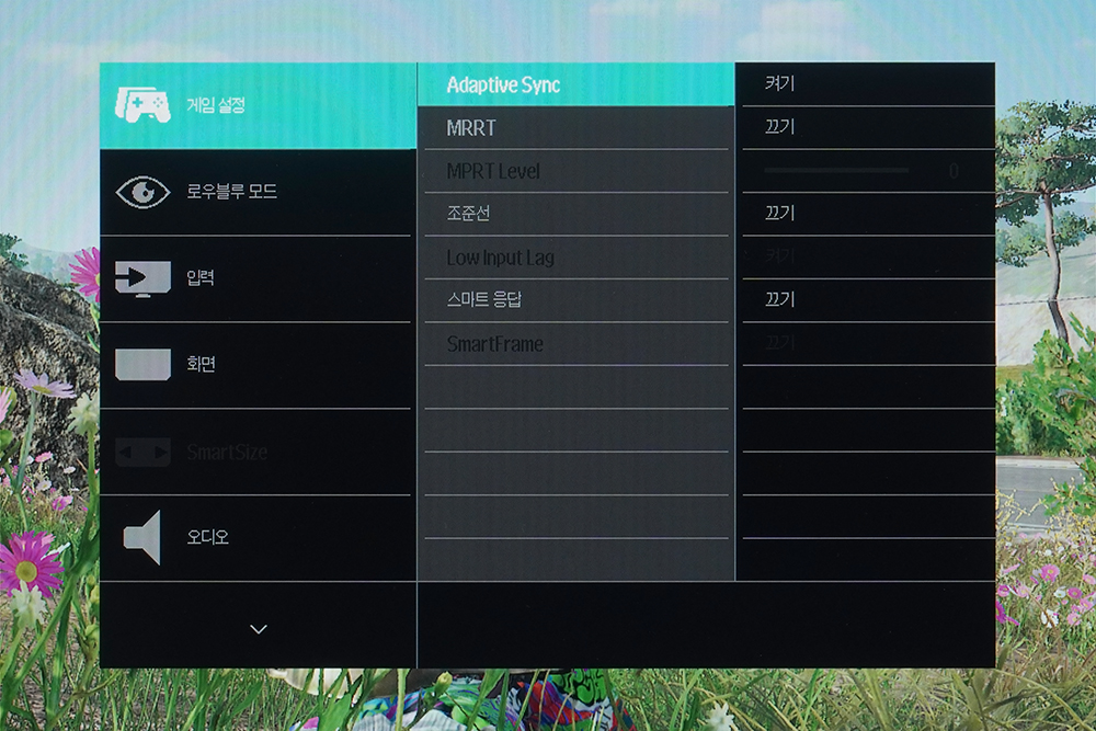 필립스 27M1N3200Z 게이밍 모니터의 OSD를 확인해 보면 게임 설정에서는 Adaptive Sync나 MPRT 기능을 켜고 끌 수 있는 기능들이 준비되어 있습니다. 그 외에도 조준선 표시와 인풋렉 제어 기능도 탑재되었습니다.