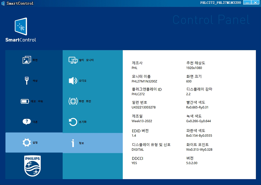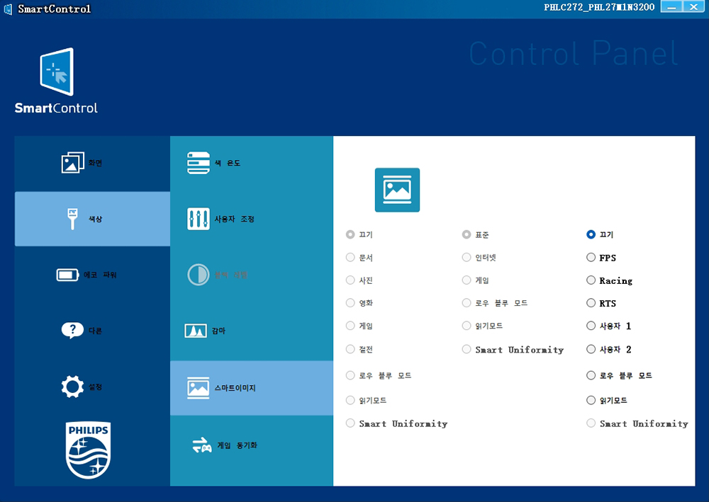 필립스 27M1N3200Z 게이밍 모니터는 스마트 컨트롤(SmartControl)이라는 전용 소프트웨어를 이용해서 OSD 버튼을 누르지 않고도 마우스를 이용해서 각종 설정을 변경할 수 있습니다. 상당히 편리한 기능 중의 하나라고 할 수 있습니다.
