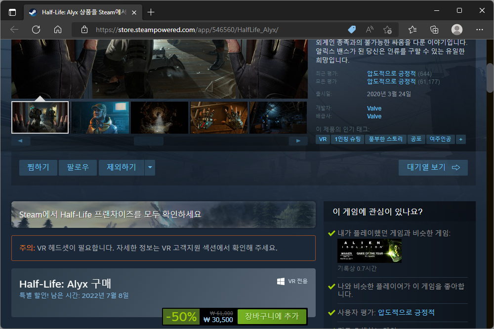 하프라이프: 알릭스(Half-Life: Alyx) 스팀의 유통사인 밸브에서 제작된 VR게임입니다. 최근에 많이 판매된 메타의 오큘러스 퀘스트2와 같은 제품을 이용하면 신세계를 경험할 수 있다는 평가입니다. 가격은 30,500원입니다.