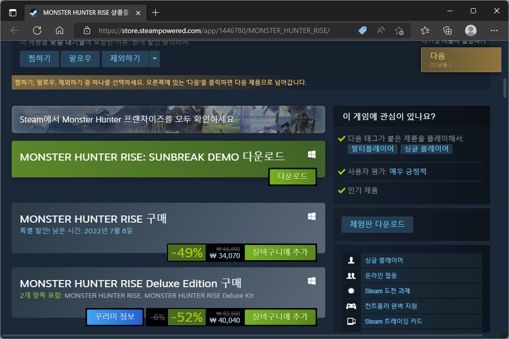 몬스터 헌터 라이즈(Monster Hunter Rise)는 캡콤에서 개발한 헌팅 액션 게임입니다. 역시 독특한 게임성으로 많은 팬들을 거느리고 있습니다. 가격은 34,070원입니다.