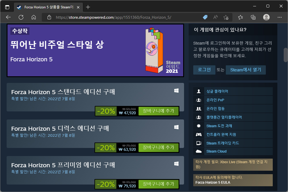제가 가장 먼저 추천하는 게임은 포르자 호라이즌 5(FORZA HORIZON 5)입니다. 엑스박스 게임 스튜디오 산하의 플레이그라운드 게임즈와 Turn 10 스튜디오가 개발하고 있는 오픈 월드 레이싱 게임으로 제작사의 특성상 완전 한국화를 지원합니다. 가격은 스탠다드 에디션은 47,920원, 디럭스 에디션은 63,920원, 프리미엄 에디션은 79,920원입니다.