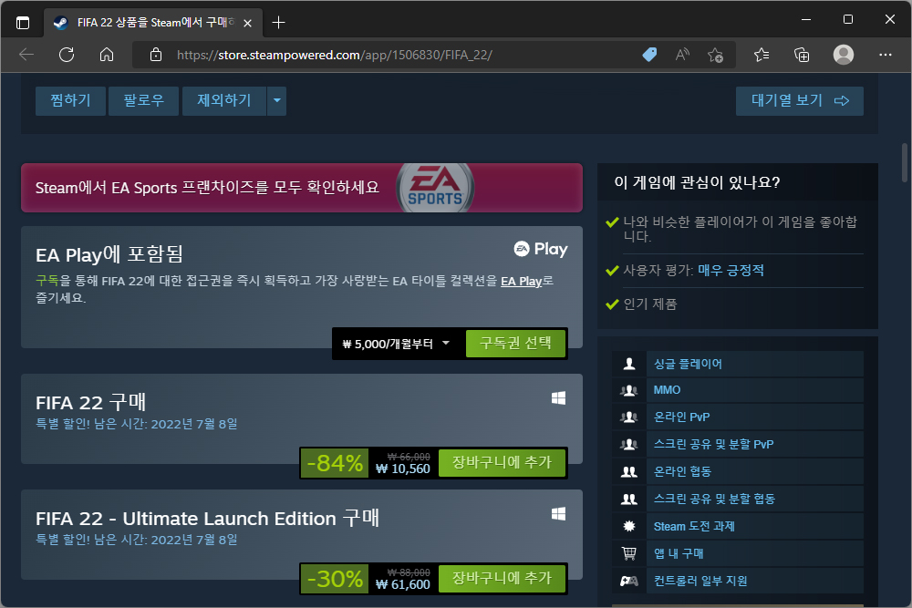 피파 22(FIFA 22)도 역시 EA에서 개발한 축구 소재 스포츠 게임입니다. 시리즈 자체가 워낙 오래되었고 팬들도 많은 편입니다. 참고로 피파와의 계약 만료로 다음 버전부터는 이름이 변경된다고 합니다. 가격은 10,500원입니다.