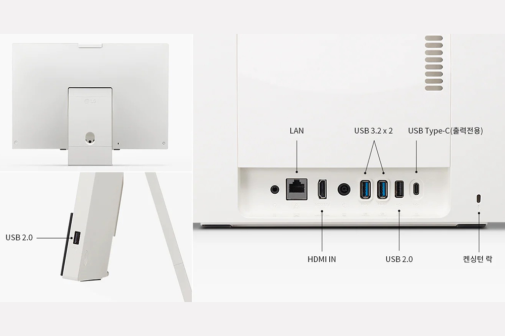 LG 일체형 PC 27V70Q의 입출력 포트를 확인해 보면 HDMI IN과 2개의 USB 3.2 그리고 2개의 USB 2.0 포트, USB-C 단자가 탑재되었습니다. 확장성은 준수한 수준이라고 판단되었습니다.