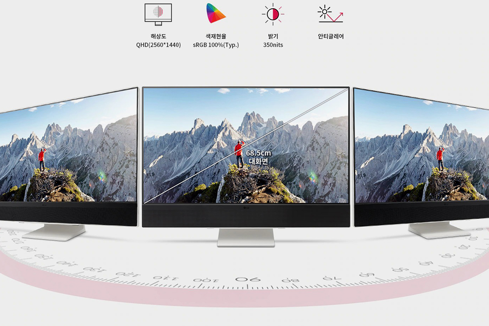 LG 일체형 PC 27V70Q(27V70Q-GA56K)에는 27인치 QHD(2560 x 1440) 해상도의 디스플레이가 탑재되었는데요. 베젤이 슬림한 편이어서 콘텐츠에 더욱 몰입할 수 있는 것은 물론이고 제품 자체의 크기도 상대적으로 콤팩트한 느낌을 주는 편입니다.