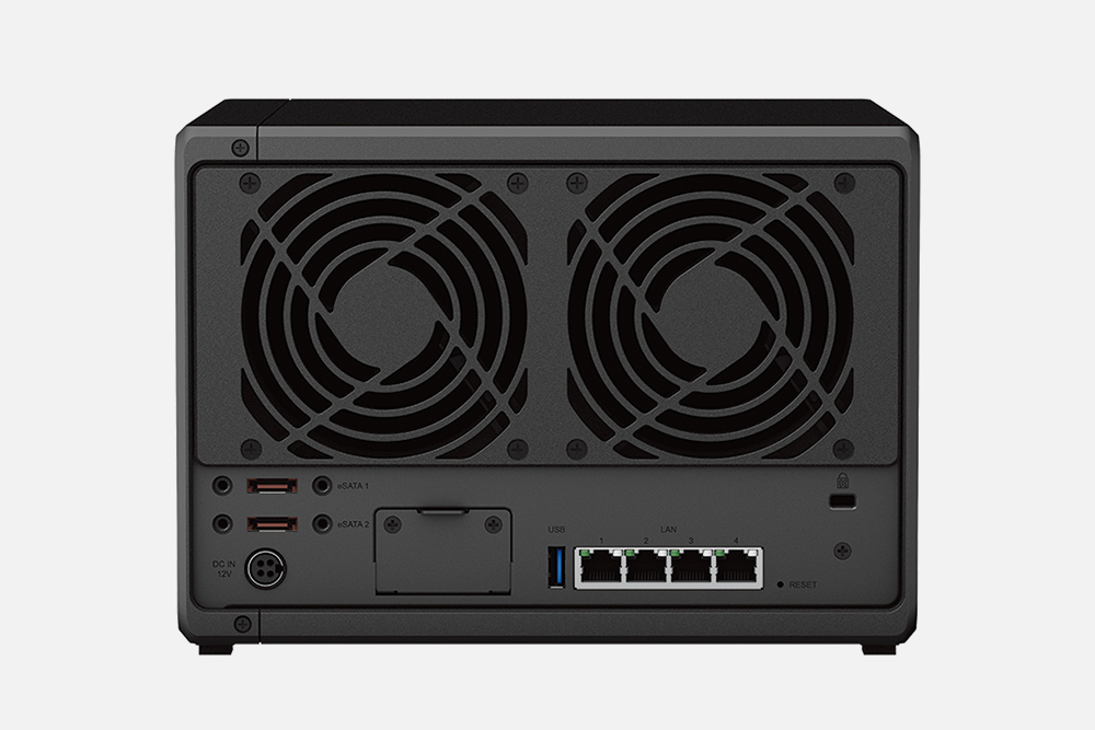 시놀로지 DS1522+의 입출력 포트를 확인해 보면 4개의 1GbE LAN 포트와 2개의 eSATA 포트 그리고 USB 3.2 Gen 1 포트가 배치되어 있습니다. 재미있는 부분은 네트워크 업그레이드 슬롯을 이용해서 10GbE로 업그레이드를 할 수 있다는 점입니다. 물론 추가 비용이 소요됩니다.