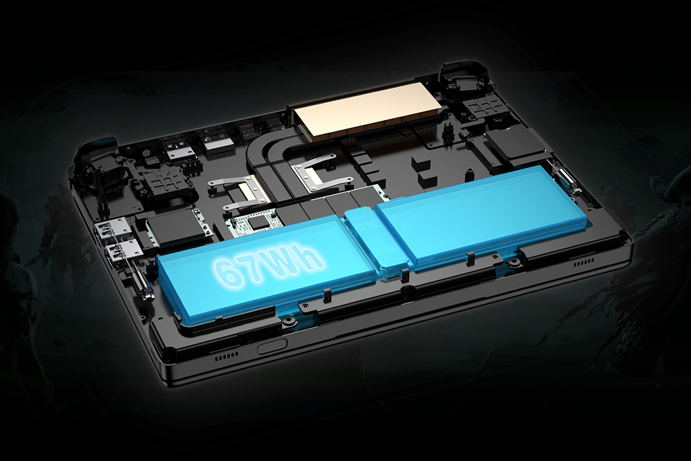 GPD WIN Max 2에는 67Wh 용량의 배터리가 탑재되었습니다. 게임은 5시간 동영상 재생은 6~8시간, 오피스 작업은 최대 14시간 정도 할 수 있다고 합니다. 이러한 수치는 화면의 밝기에 따라서 큰 차이가 발생할 수 있습니다.