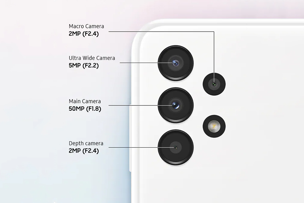 삼성 갤럭시 A13에는 5,000만 화소(F/1.8)의 광각(77도)과 500만 화소(F/2.2)의 초광각(123도) 그리고 각각 200만 화소의 접사와 심도 쿼드 카메라가 탑재되었습니다. 특히 심도 카메라를 내장해서 아웃포커스를 어느 정도 흉내 낼 수 있는 특징이 있습니다. 그리고 OIS와 같은 손 떨림 보정 기능은 내장되지 않았습니다.