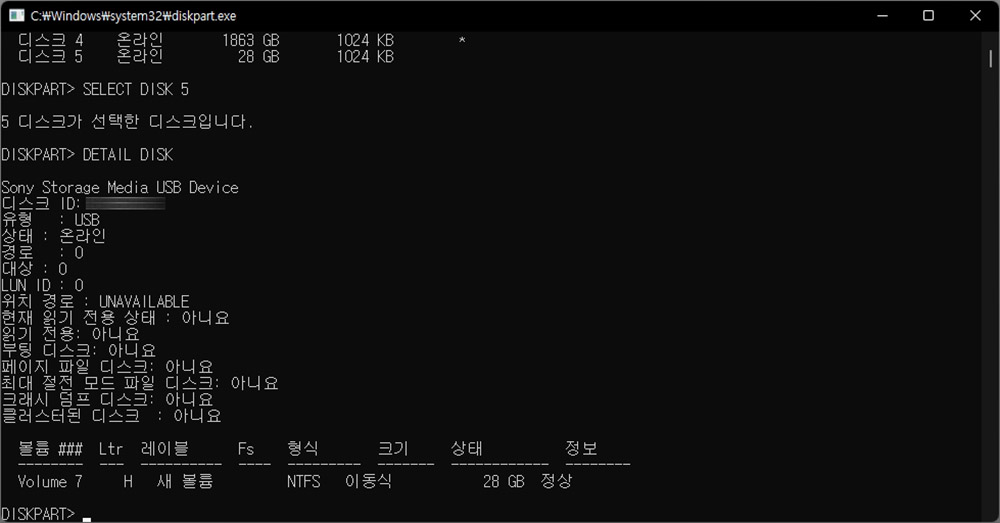 USB 메모리를 선택한 후에 DETAIL DISK를 입력하면 현재 선택된 디스크의 정보를 확인할 수 있습니다. 여기에서 우리는 유형의 USB 여부를 확인해 보아야 합니다. 만약 사용하고 있는 다른 드라이브의 파티션을 삭제한다면 난감한 상황이 발생할 수 있습니다.