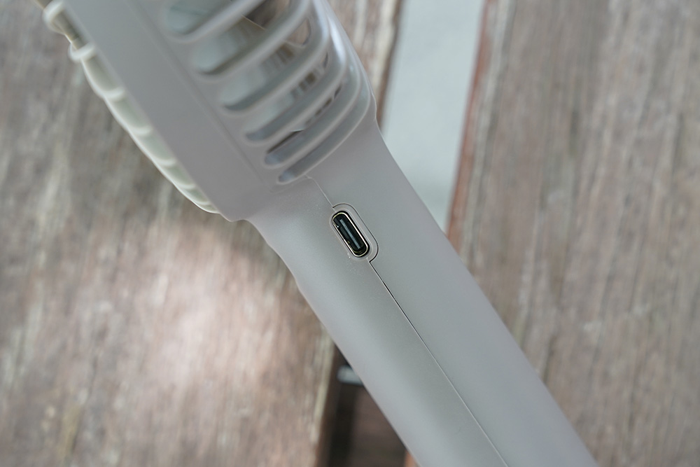 오난코리아 팬 프로 3세대 핸디형 선풍기의 옆면을 살펴보면 충전을 위한 USB-C 포트가 준비되어 있습니다. 참고로 2,800mAh 용량의 배터리를 탑재해서 3시간 30분 정도 충전을 하면 3시간에 15시간 정도 사용할 수 있다고 합니다.