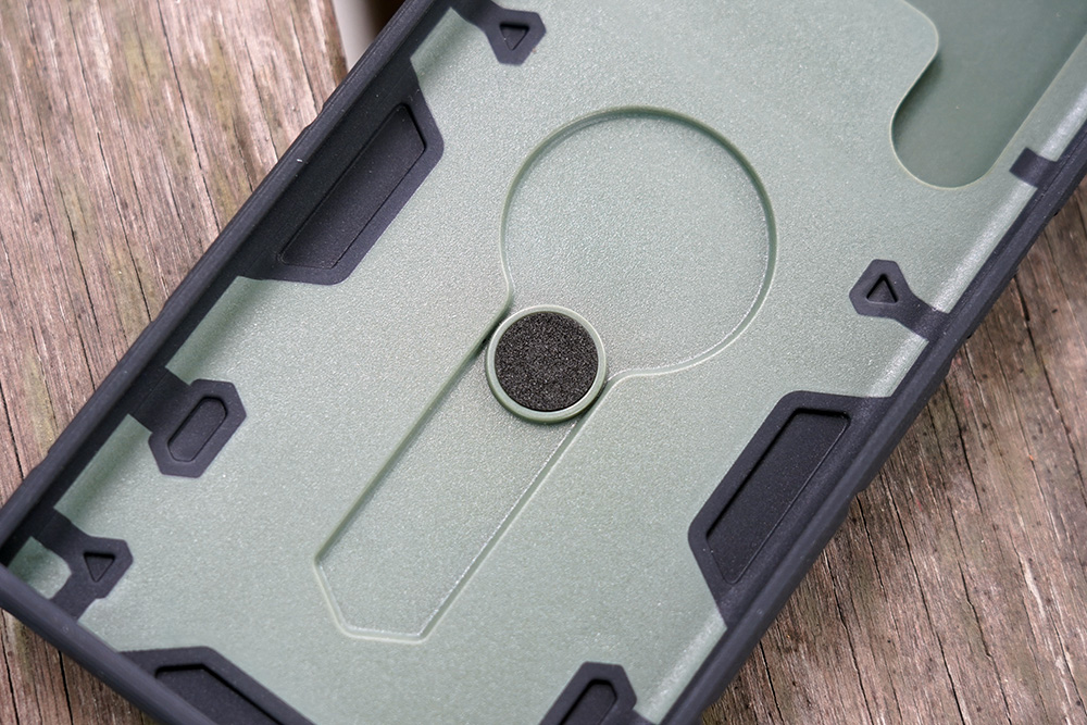 갤럭시 S22 울트라 닐킨 캠쉴드아머 케이스의 내부를 확인해 보면 중간의 스마트링이 연결된 부분을 제외하고는 별도의 패브릭처리가 되어 있지 않은 것을 확인할 수 있습니다. 조금은 아쉬운 부분이라고 할 수 있습니다.