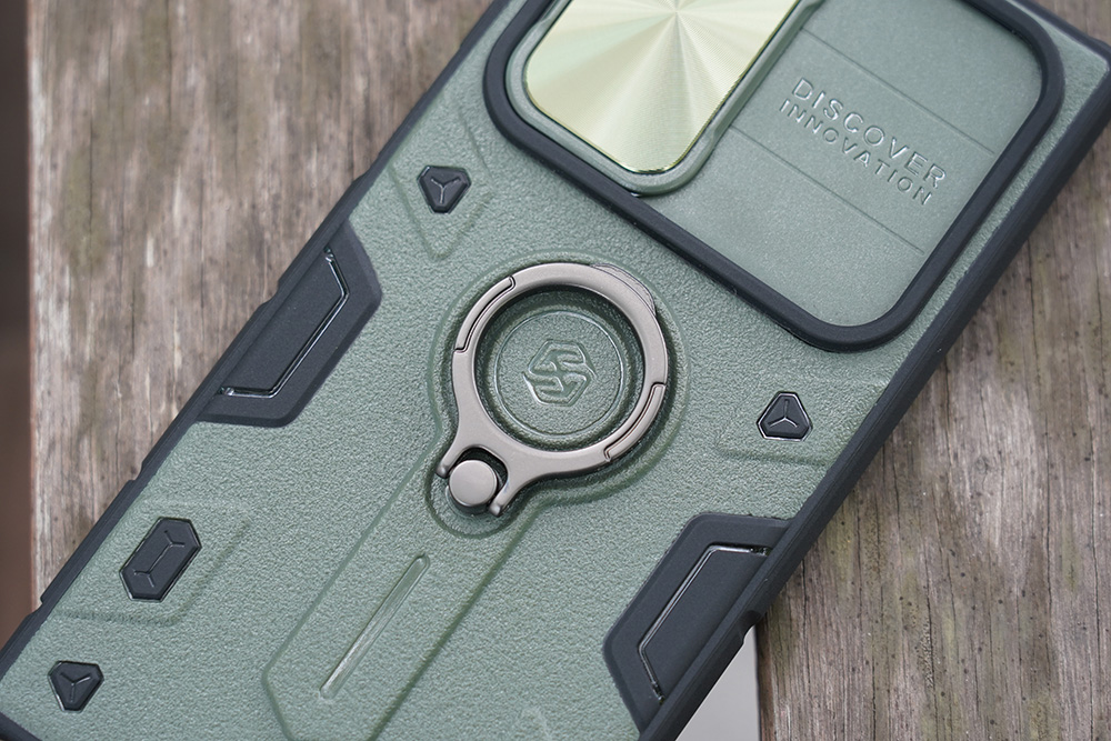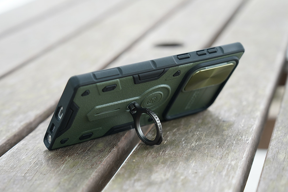 갤럭시 S22 울트라 닐킨 캠쉴드아머 케이스에는 아연 합금 소재로 제작된 스마트 링이 기본으로 부착되어 있습니다. 제법 단단하게 고정되어 있어서 편리하게 활용할 수 있습니다. 그렇지만 일체형이라서 오랜 시간 사용하면 문제가 생길 수도 있을 것 같습니다.