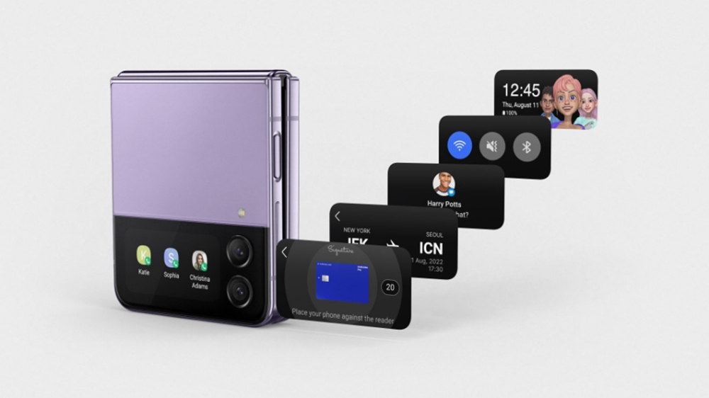 삼성 갤럭시Z 플립4의 외부에는 1.9인치 512x260 해상도의 슈퍼 아몰레드 디스플레이가 탑재되었습니다. 홍보 이미지를 확인해 보면 삼성 페이나 전화 등 다양한 용도 등으로 활용할 수 있을 것으로 예상합니다.