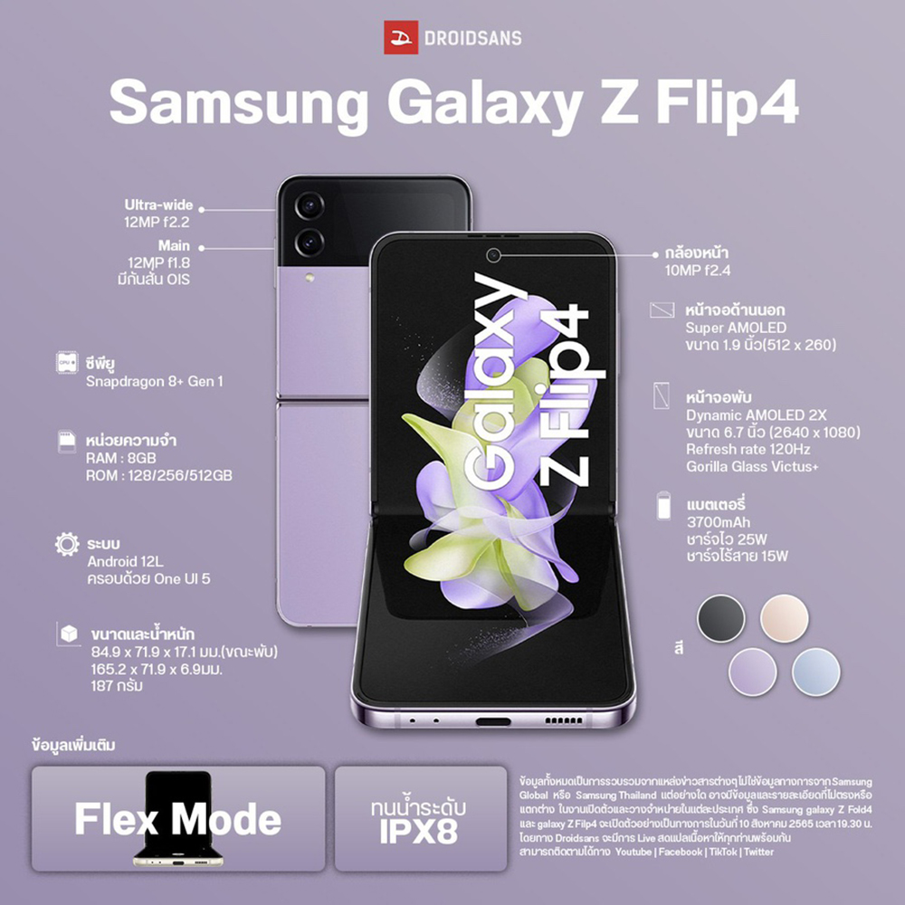 삼성 갤럭시Z 플립4의 공식 홍보 이미지를 확인해 보면 퀄컴 스냅드래곤 8+ Gen 1 SM8475 프로세서와 8GB 램 그리고 256/512GB 내장 메모리가 탑재되었습니다. 그리고 가장 중요한 요소라고 할 수 있는 무게는 187g으로 플립3가 183g이었던 것과 비교하면 약 4g정도 무거워진 것을 확인할 수 있습니다. 그리고 배터리 용량이 3,700mAh로 증가했고 사용 시간 역시도 크게 늘어났다고 합니다. 스트레스에서 조금 벗어날 수 있을 것 같습니다.