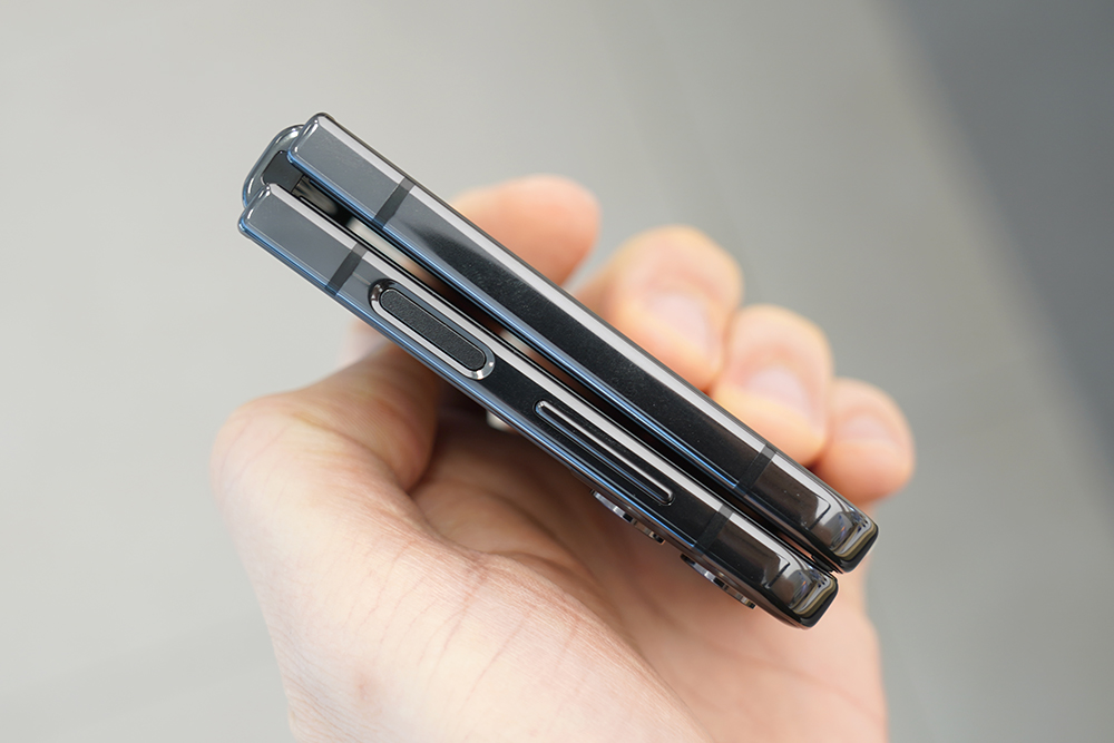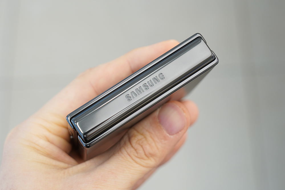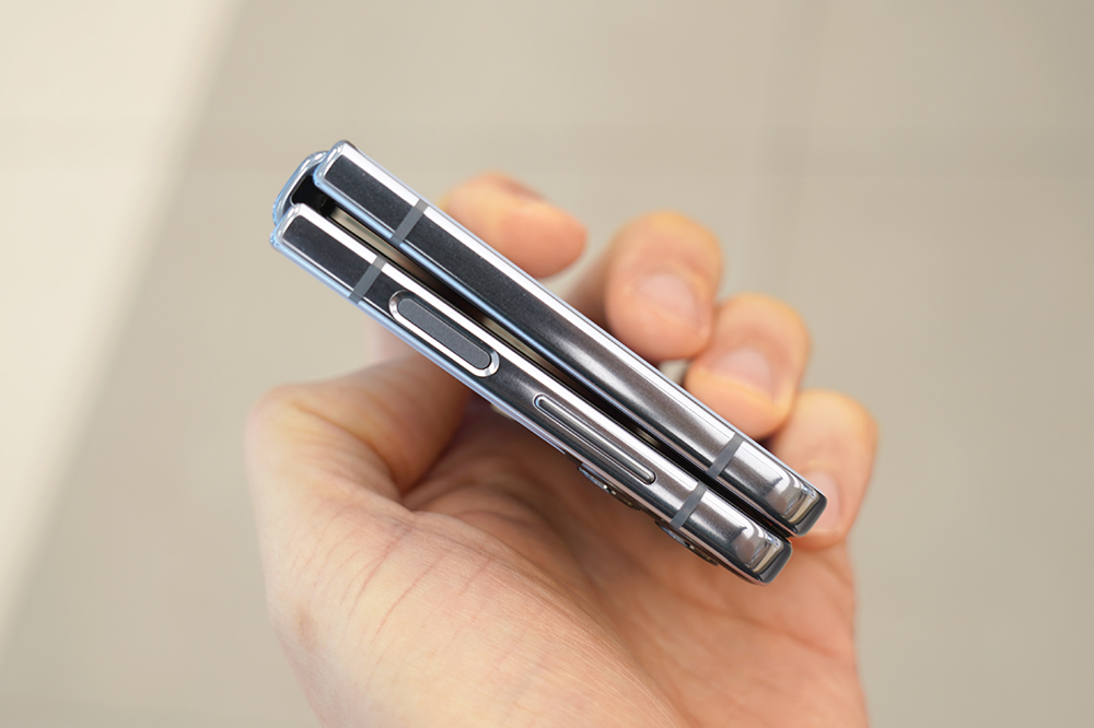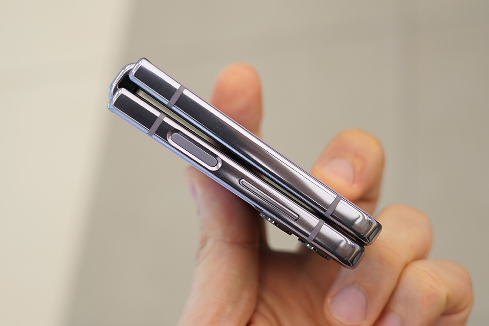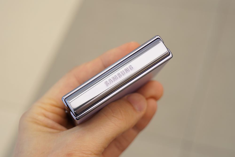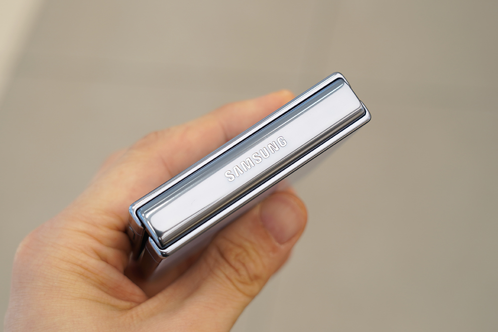 갤럭시 Z 플립4의 힌지와 프레임은 유광으로 제작되었습니다. 특히 힌지의 사이즈가 이전 세대의 제품인 플립3와 비교해서 줄어들었다는 점이 체감될 정도였습니다. 그리고 측면에는 지문 인식 센서가 탑재되었고 위치가 적절해서 크게 불편함 없이 사용할 수 있을 것으로 예상합니다.