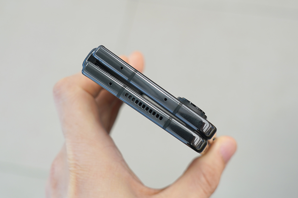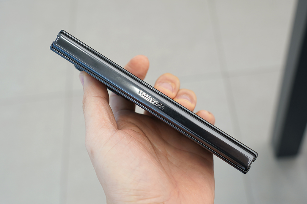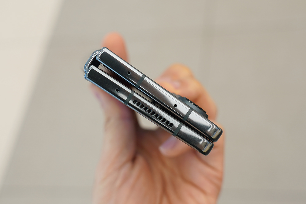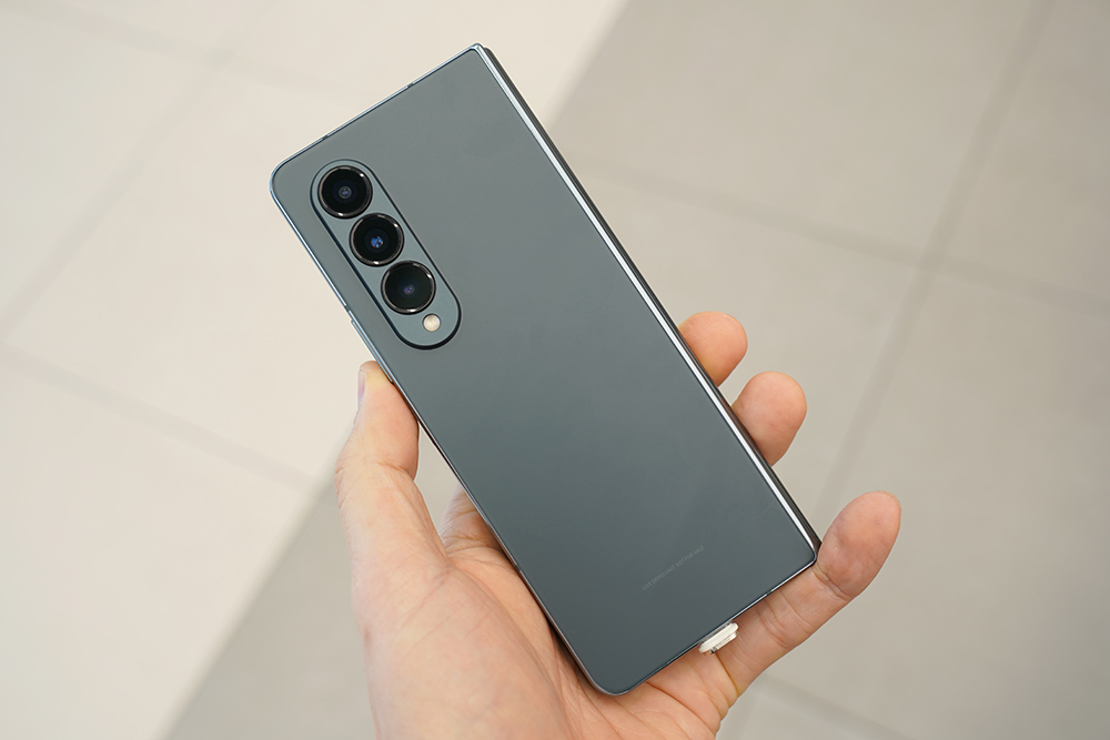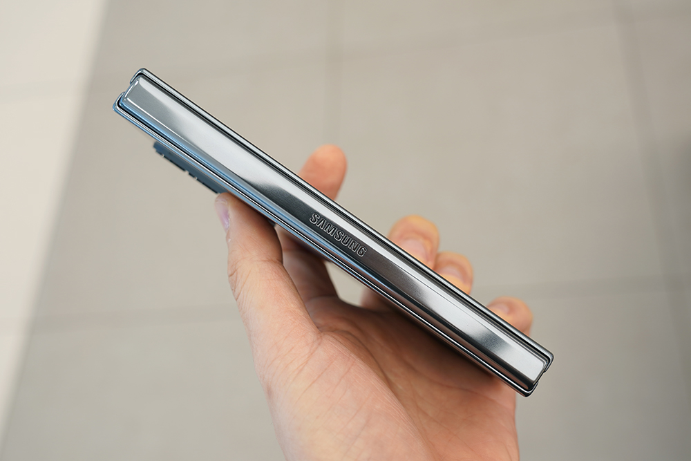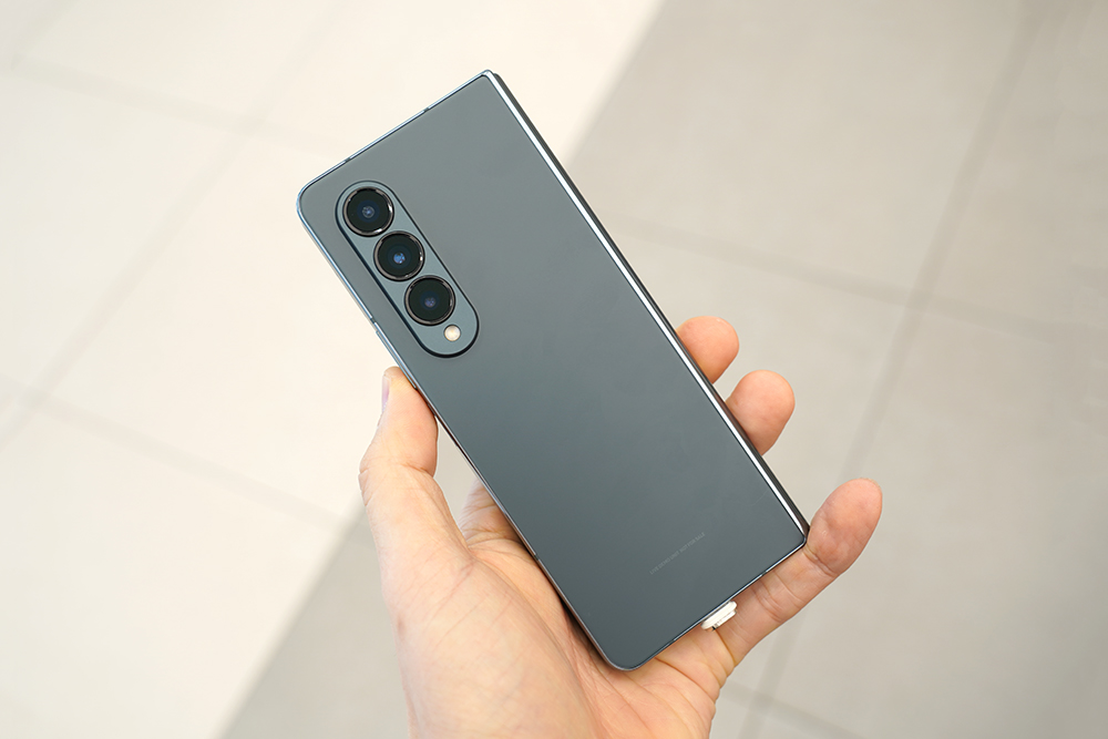 갤럭시 Z 폴드4의 뒷면은 매트한 무광으로 마무리되었고 힌지는 유광으로 제작되었습니다. 전체적으로 깔끔한 느낌을 주는 편입니다. 참고로 힌지의 구조가 개선되었다고 하는데요. 폴드3와 비교해서 크기가 줄어든게 체감이 될 정도였습니다.