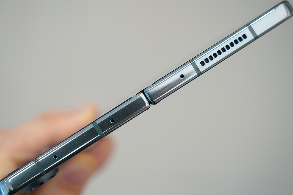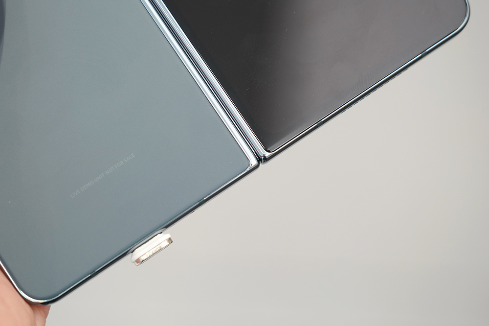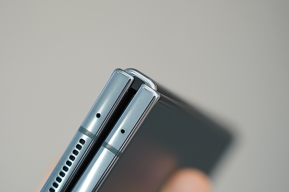 삼성 갤럭시Z 폴드4의 힌지는 완전히 펼치면 뒷부분이 완벽하게 밀착하지는 않는 것을 확인할 수 있습니다. 크게 불편하지는 않지만 완성도 측면에서 약간 아쉬운 부분이기도 합니다. 그리고 전체적인 구조 자체는 상당히 단단하게 만들어졌다는 느낌을 받았습니다.