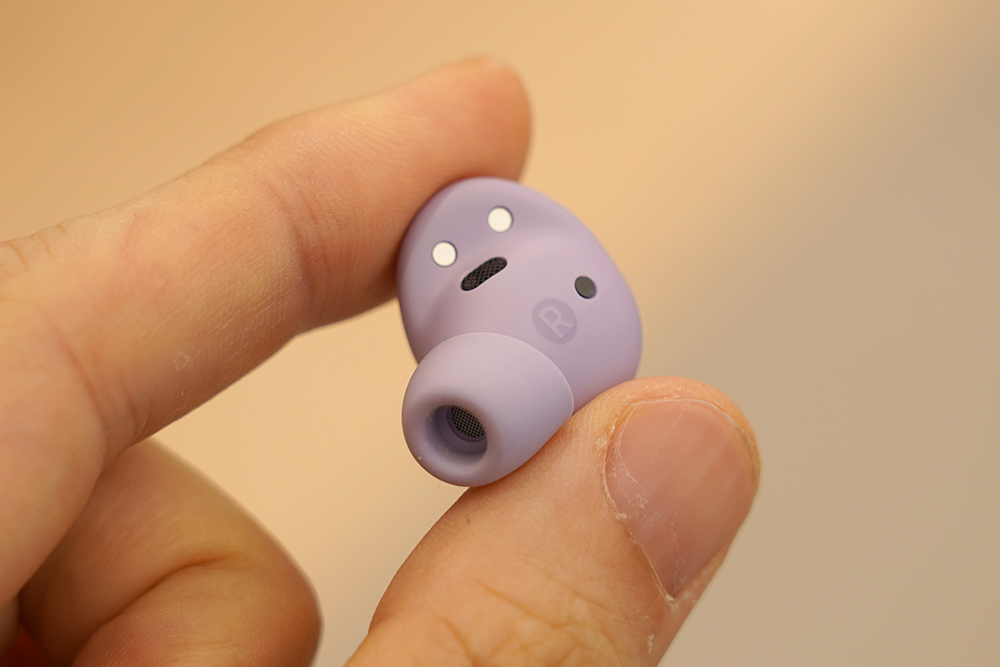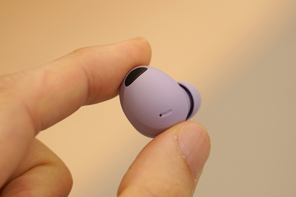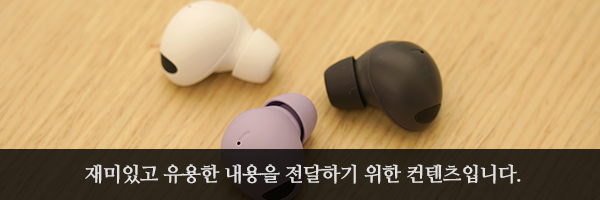 갤럭시 버즈2 프로의 유닛 크기는 버즈 프로와 비교해서 약 15% 정도 작아졌습니다. 그래서 편안한 착용감을 제공한다고 합니다. 착용감 덕분에 외이도염과 같은 이슈는 없을 것으로 예상합니다. 그리고 보라 퍼플 색상은 세련된 느낌을 주는 편이라고 생각되었습니다.