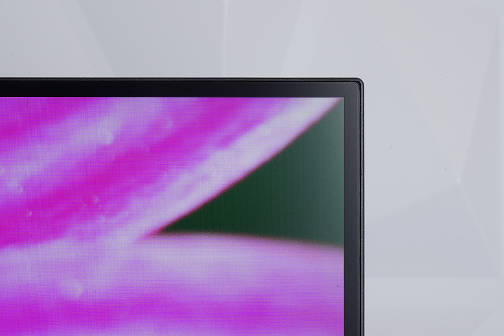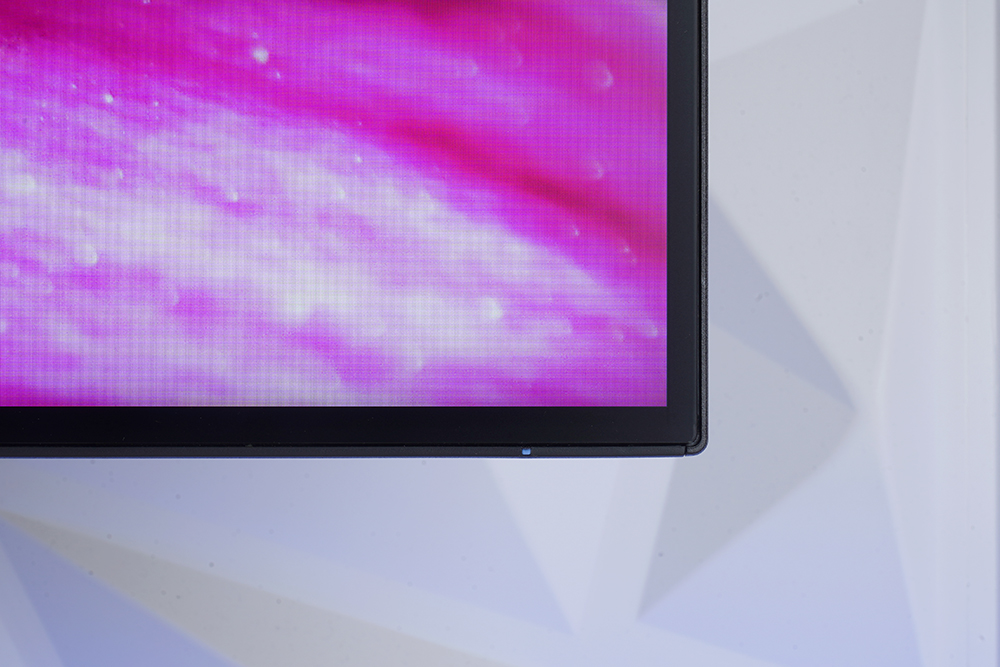그리고 4면 보더리스 디자인이 적용되었습니다. 플라스틱 베젤은 1.7mm이고 블랙 매트릭스는 5.9mm로 상당히 슬림한 편입니다. 그래서 콘텐츠에 더욱 몰입할 수 있는 것은 물론이고 다중 모니터를 사용하는 분들에게도 유용한 특징입니다. 그 외에도 오른쪽 아래에는 상태를 표시해주는 LED가 내장되어 있습니다.