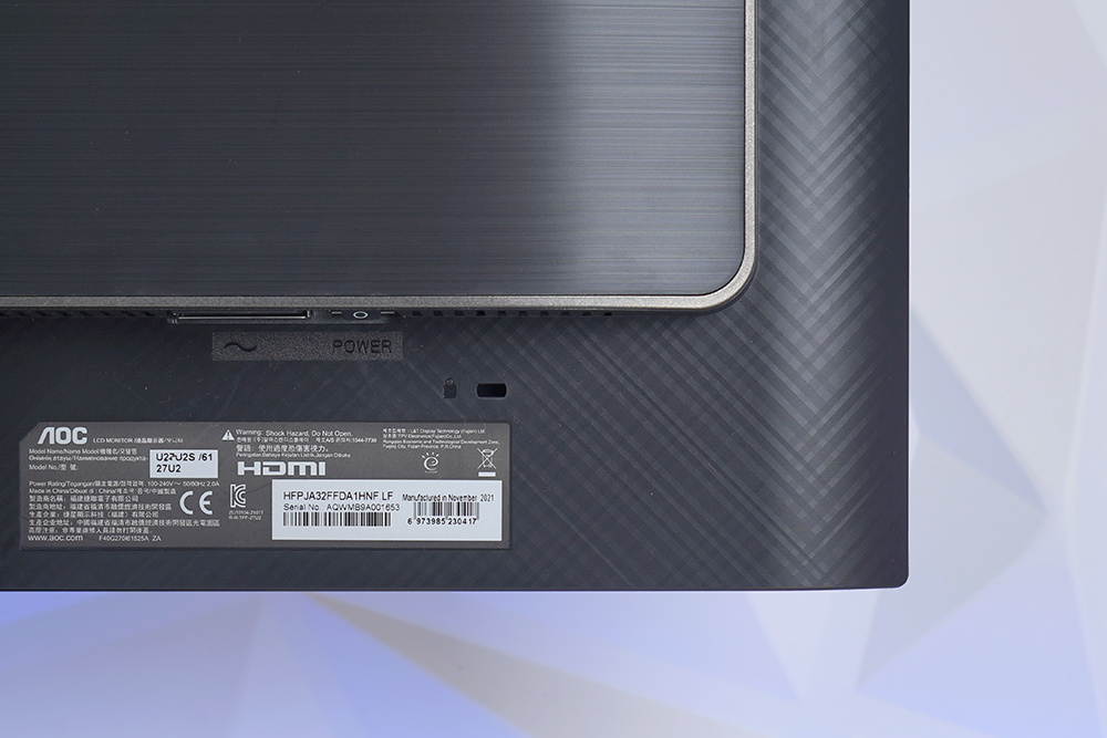 오른쪽에는 시리얼 넘버가 인쇄된 스티커가 부착되어 있고 옆쪽에는 켄싱턴 락 홈이 준비되어 있습니다. 공개된 장소에 알파스캔 AOC U27U2S 모니터를 설치해서 사용할 때 활용해 주면 좋을 것 같습니다.
