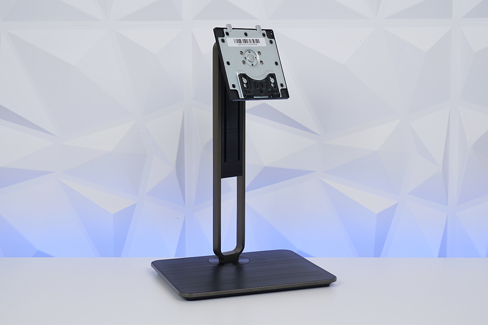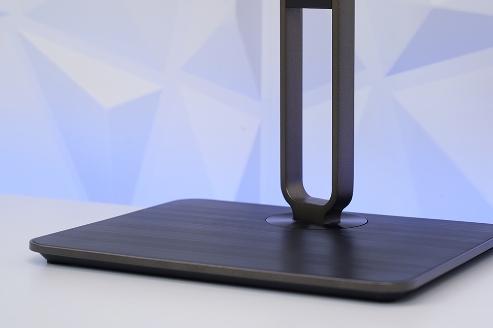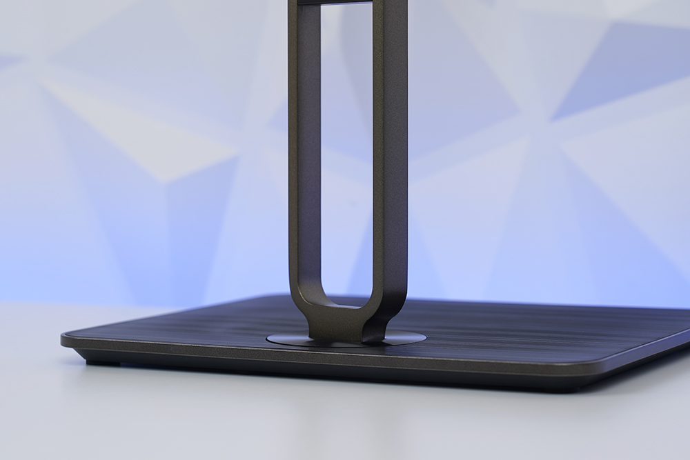 베이스의 위쪽에는 헤어 라인이 들어가 세련된 느낌을 주는 편입니다. 그리고 공간에 여유가 있어서 여러 제품을 올려놓을 수도 있을 것 같습니다. 그리고 스탠드의 중간은 구멍이 뚫려 있어서 케이블을 정리하는 목적으로 활용할 수 있습니다.