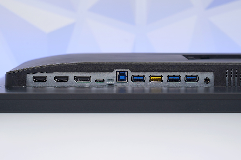 입출력 단자를 살펴보면 2개의 HDMI 2.0과 1개의 DP 1.4 그리고 USB-C(DP Alt Mode, PD 90W)와 KVM 스위치 기능을 위한 USB 포트들이 준비되어 있습니다. 참고로 노란색 USB 단자는 급속 충전 기능을 지원합니다.