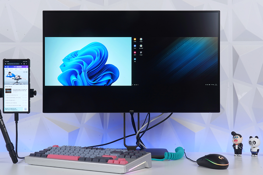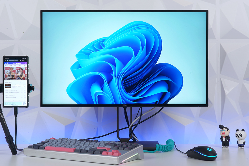 알파스캔 AOC U27U2S 모니터의 차별화된 특징은 USB-C 포트를 탑재하고 있다는 점입니다. 특히 케이블 하나로 화면 송출(DP Alt Mode)과 PD 90W 출력까지 지원해서 책상 위를 조금 더 깔끔하게 사용할 수 있는 클린데스크를 구현할 수 있습니다. 참고로 맥북은 물론이고 윈도우 노트북 그리고 삼성 덱스(DEX)와 같은 서비스를 제공하는 스마트폰과 태블릿까지 연결해서 사용할 수 있습니다.