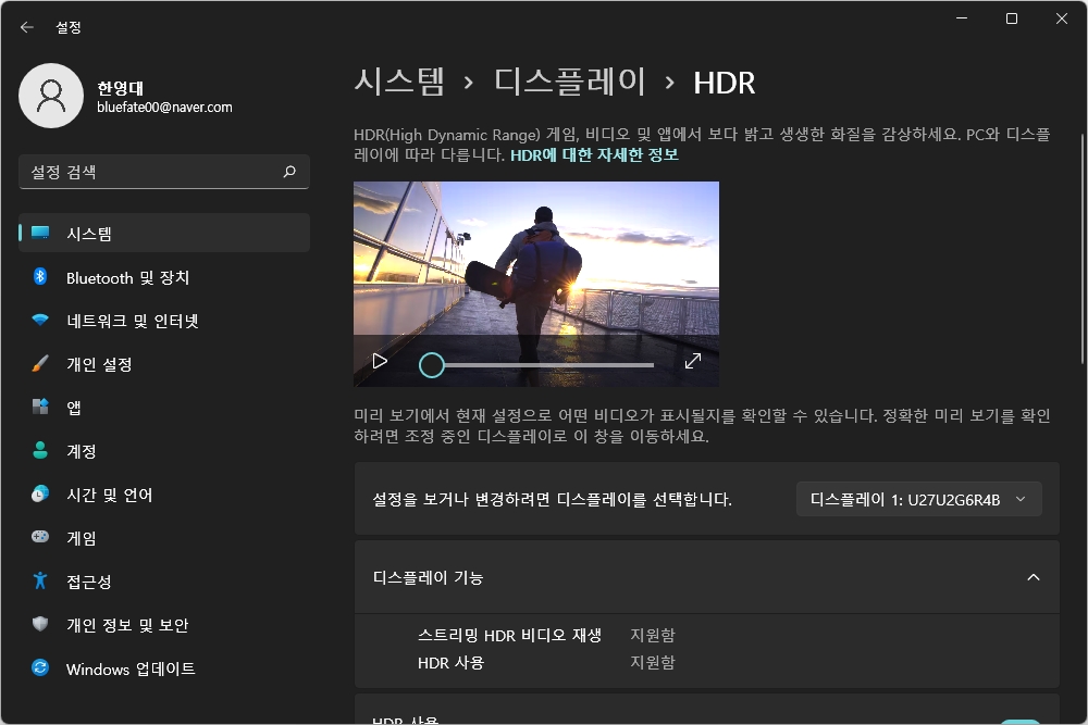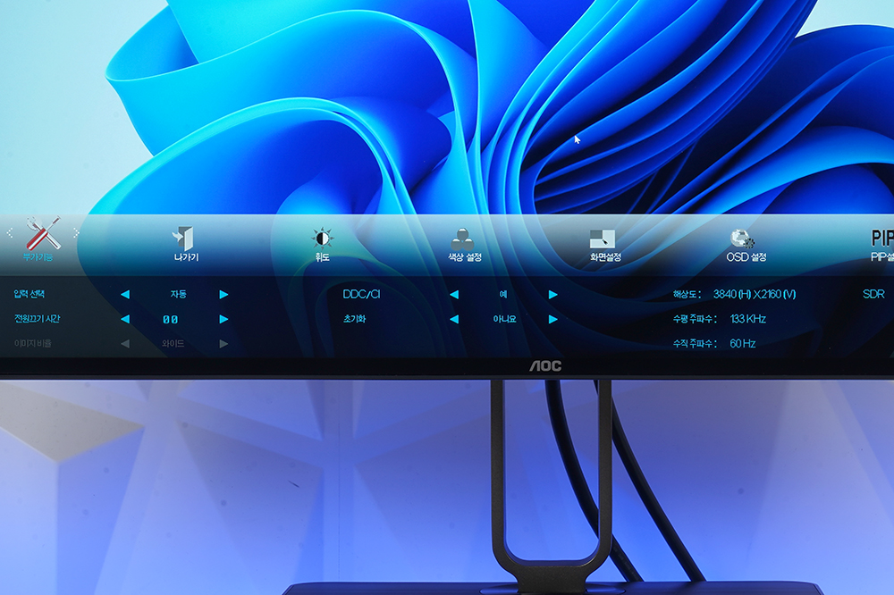 마지막으로 부가 기능에서 입력 선택과 초기화 같은 기능들이 준비되어 있습니다. 그리고 현재 해상도와 수평, 수직 주파수 그리고 SDR/HDR 정보도 한눈에 확인할 수 있습니다.