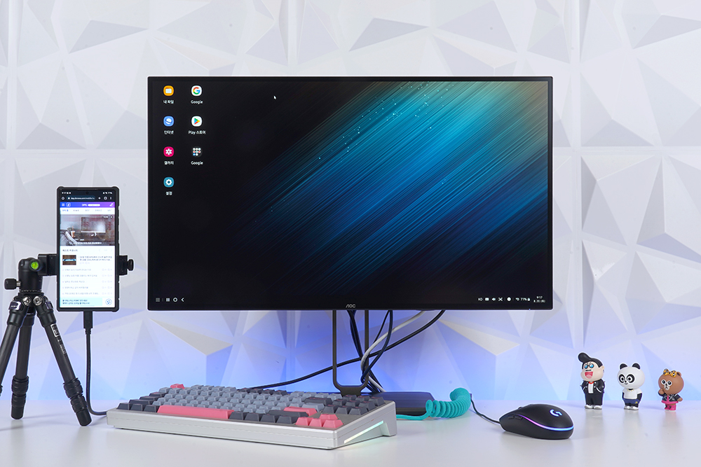 알파스캔 AOC U27U2S 모니터의 차별화된 특징은 USB-C 포트를 탑재하고 있다는 점입니다. 특히 케이블 하나로 화면 송출(DP Alt Mode)과 PD 90W 출력까지 지원해서 책상 위를 조금 더 깔끔하게 사용할 수 있는 클린데스크를 구현할 수 있습니다. 참고로 맥북은 물론이고 윈도우 노트북 그리고 삼성 덱스(DEX)와 같은 서비스를 제공하는 스마트폰과 태블릿까지 연결해서 사용할 수 있습니다.