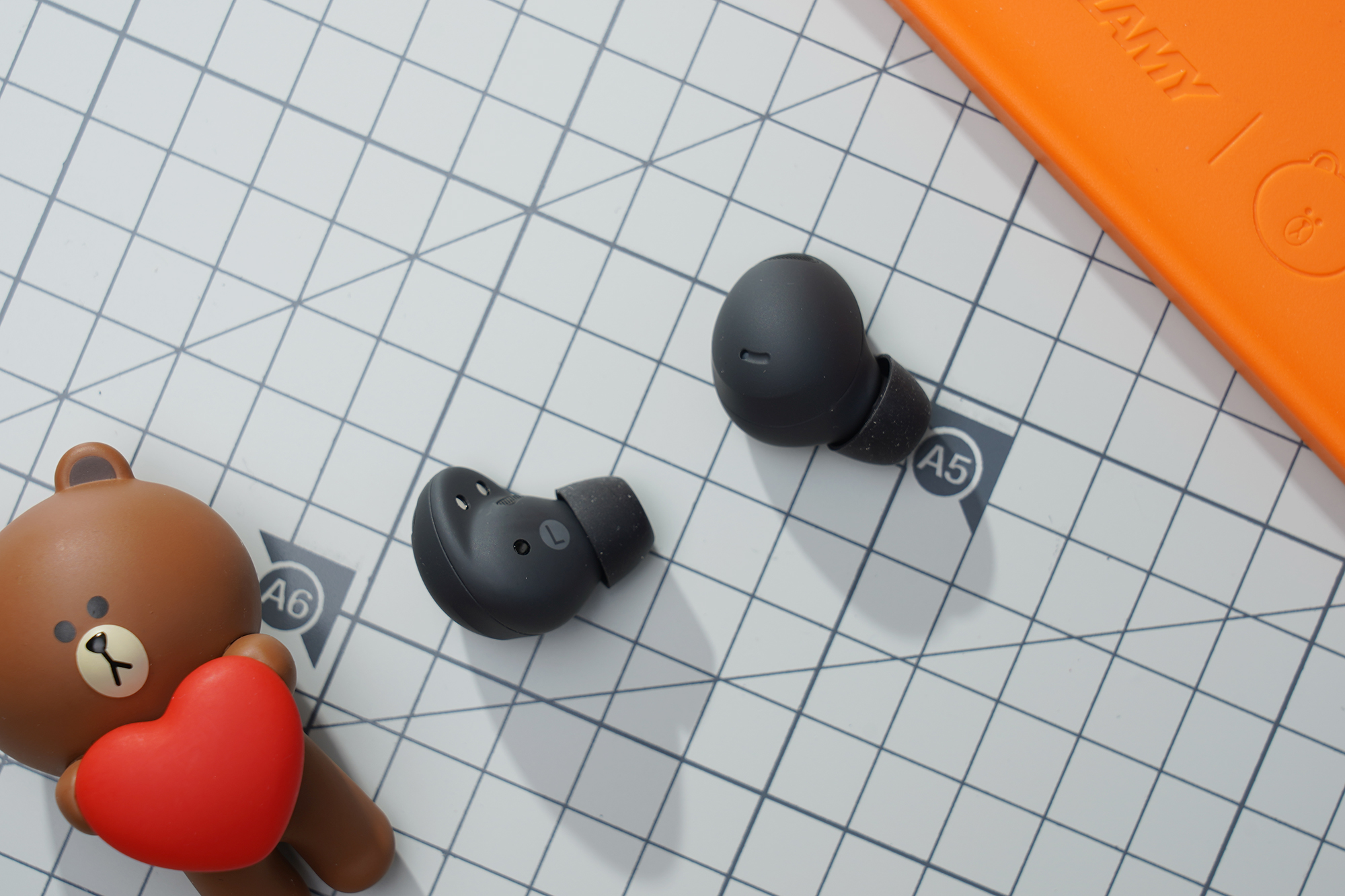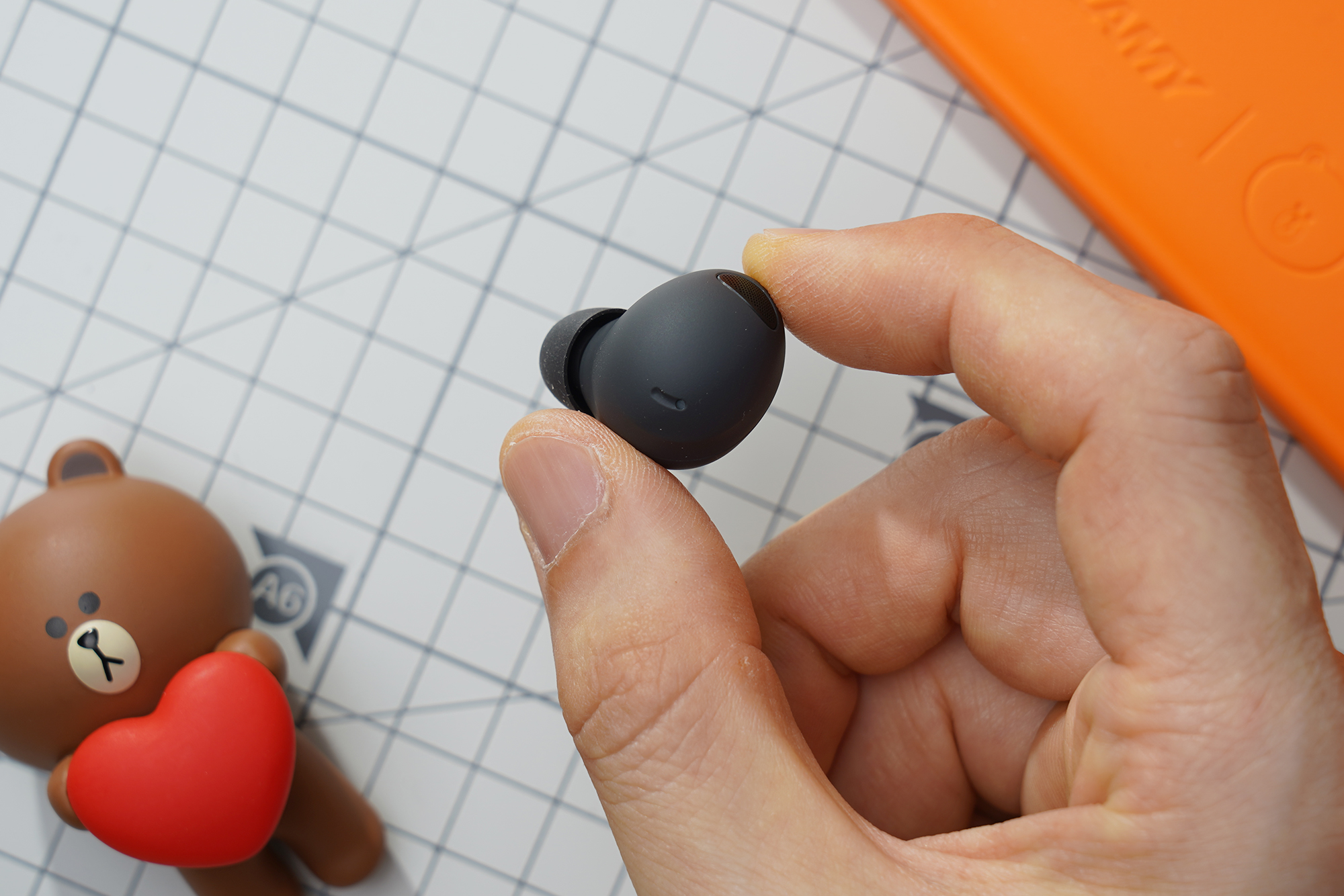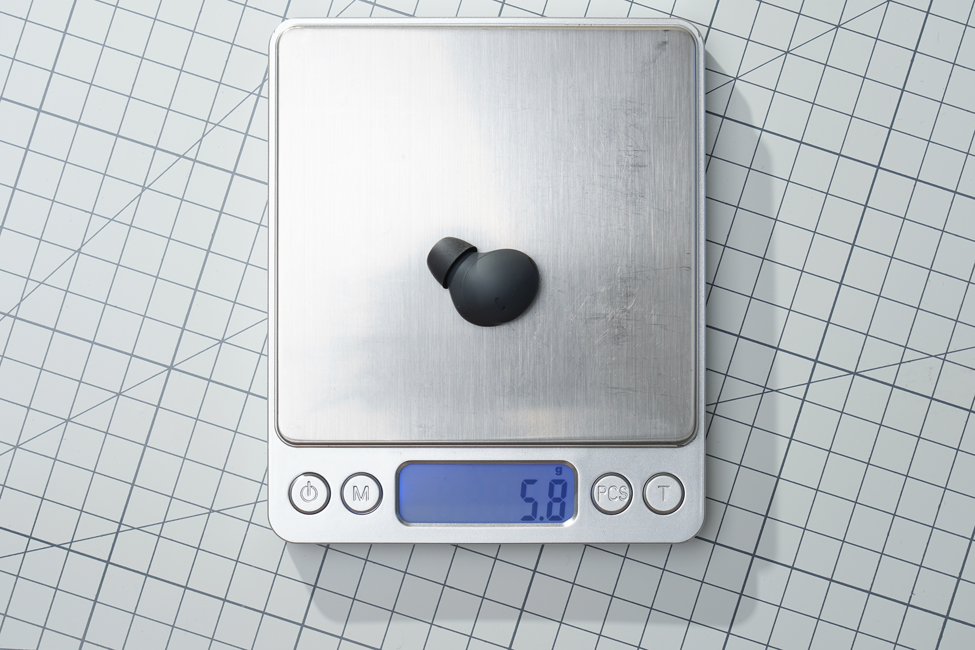 이어버드의 무게는 약 5.7~5.8g으로 측정되었습니다. 저울과 제품 자체에 약간의 편차가 있을 수 있으니 참고만 하시는 것을 추천합니다. 귀에 장착해서 사용하기에 부담이 없다는 것만은 분명합니다.