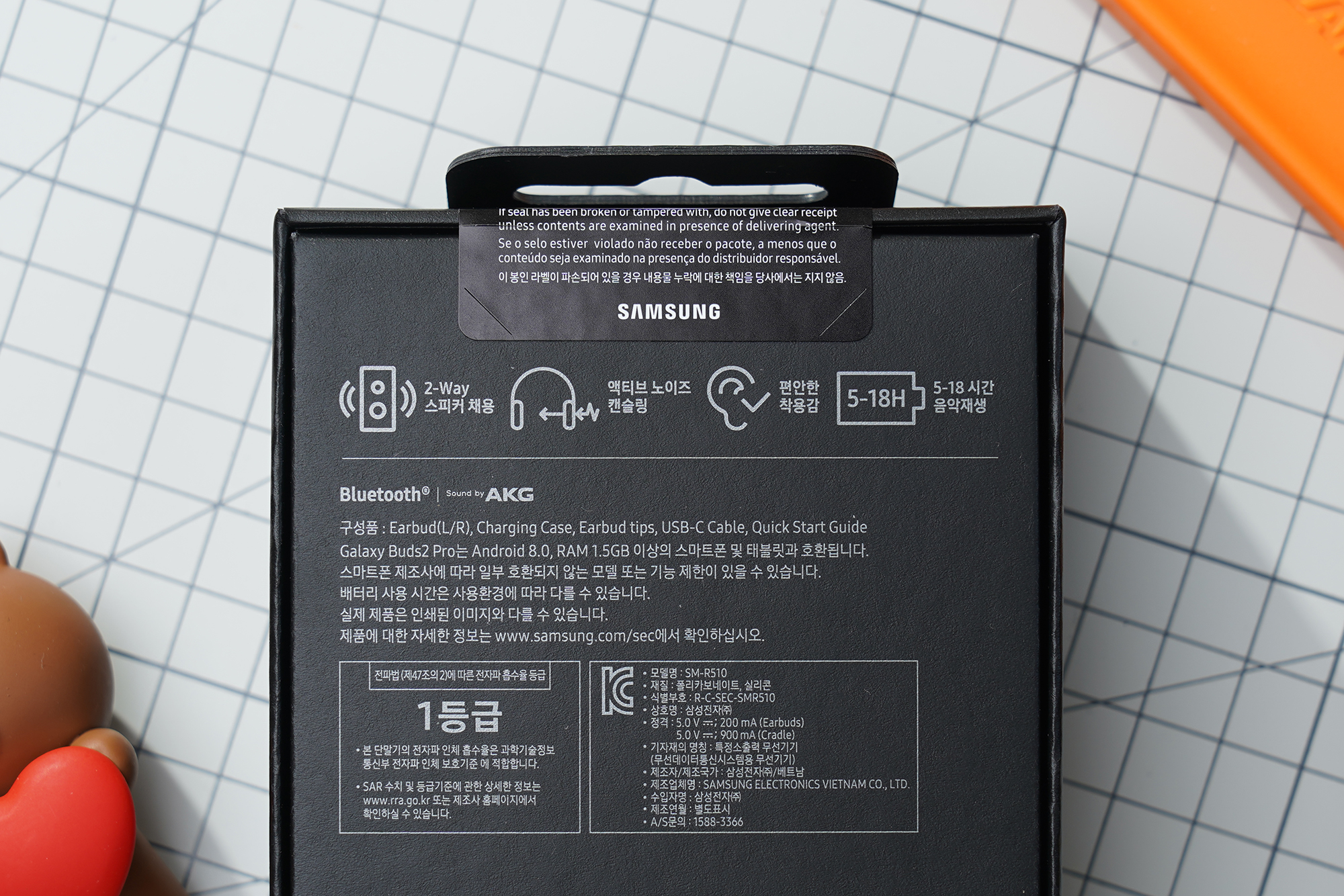 박스의 뒷면에는 갤럭시 버즈2 프로의 특징이 표시되어 있습니다. 우선 우퍼와 트위터 2-way 스피커가 탑재되었고 액티브 노이즈 캔슬링 기능을 지원합니다. 그리고 편안한 착용감과 5-18시간 정도 음악을 재생할 수 있습니다.