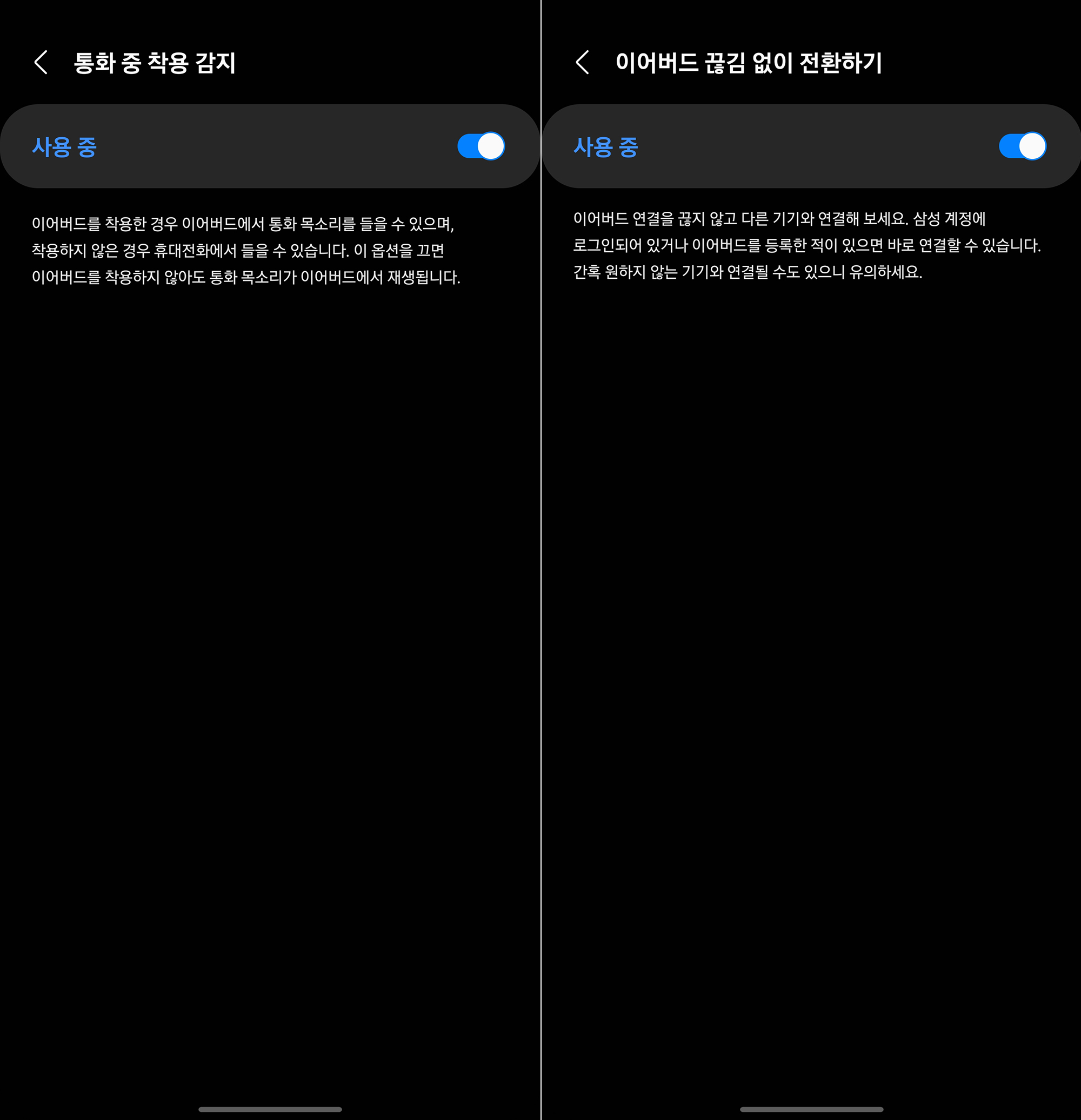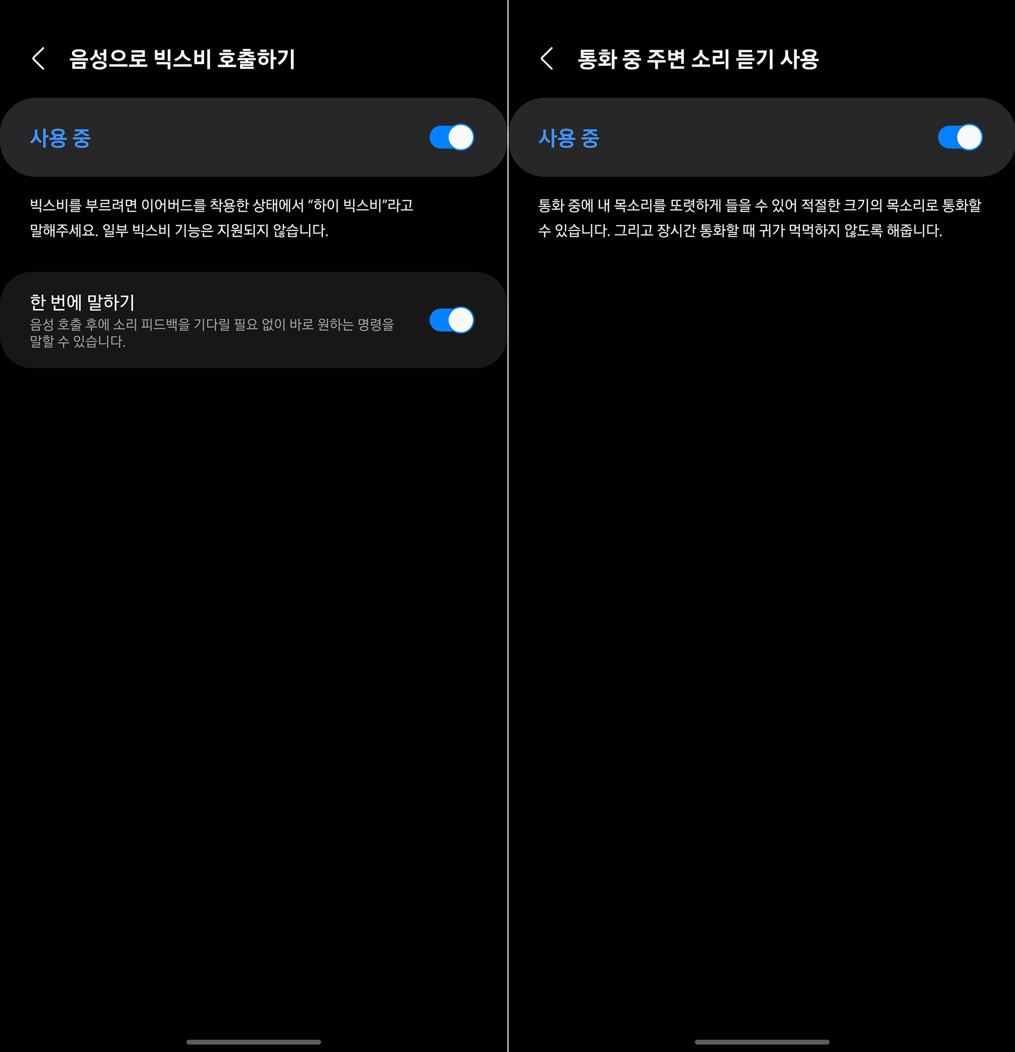 음성으로 빅스비 호출하기는 가끔 스마트폰을 꺼내기 싫을 때 활용하면 좋지만 구글 어시스턴트와 비교해서 그렇게 똑똑하다는 받지는 못했습니다. 그리고 통화 중 주변 소리 듣기 사용도 취향에 따라서 선택할 수 있습니다.