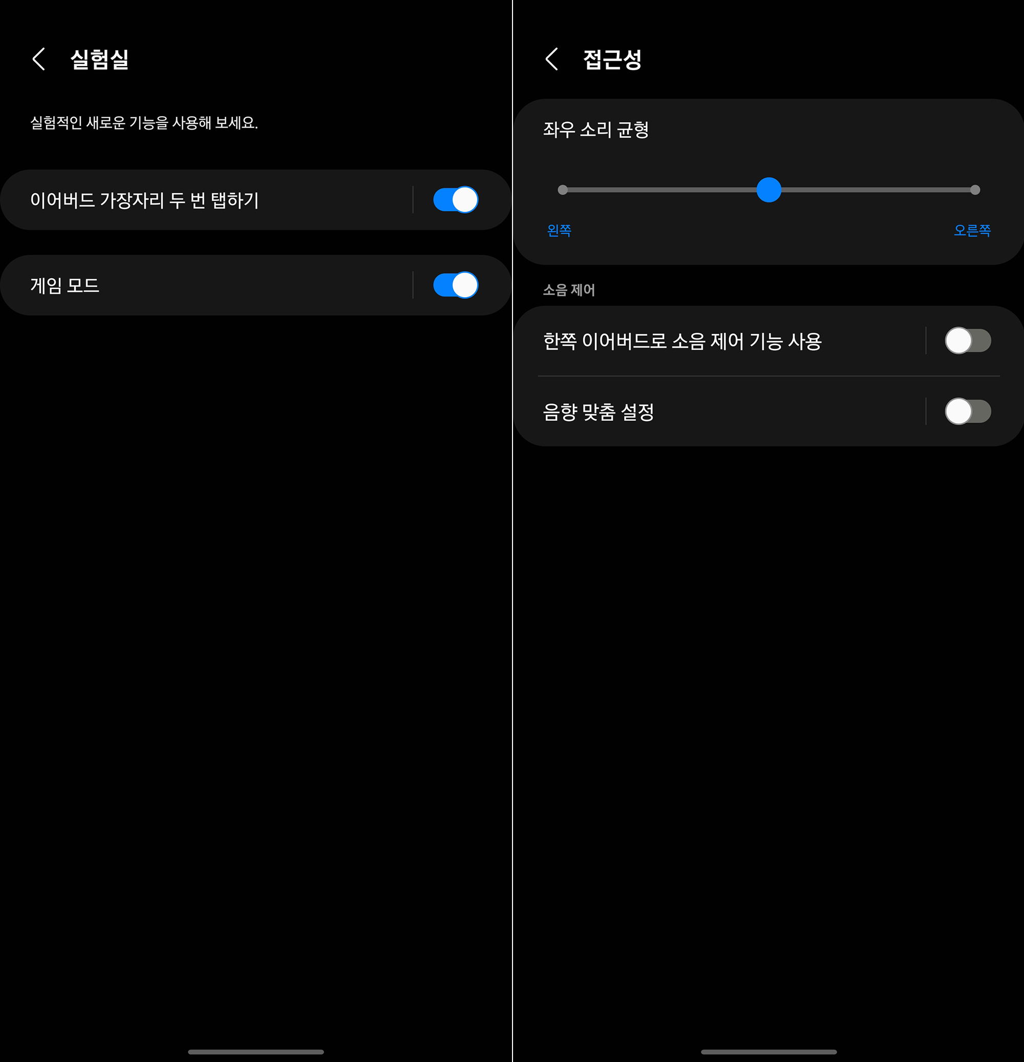실험실을 확인해 보면 이어버드 가장자리 두 번 탭하기 기능을 이용해서 볼륨을 조절할 수 있고 게임 모드를 선택하면 딜레이가 줄어듭니다. 그리고 좌우 소리 균형과 한쪽 이어버드로 수음 제어 기능 사용 등의 설정도 준비되어 있습니다.