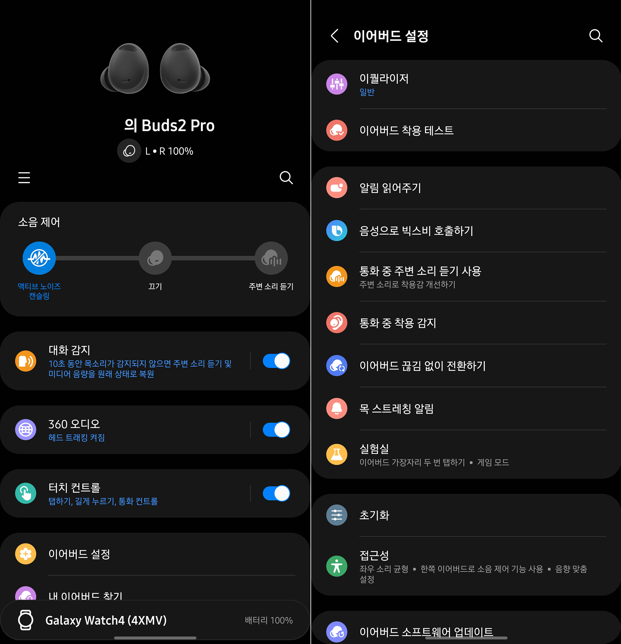 갤럭시 웨어러블(Galaxy Wearable) 앱의 기능을 확인해 보면 소음 제거 기능과 함께 대화 감지 그리고 360 오디오와 같은 기능들이 지원되는 것을 확인할 수 있습니다. 그리고 대화 감지 같은 경우에는 편리하기는 하지만 가끔 오작동이 발생했습니다.