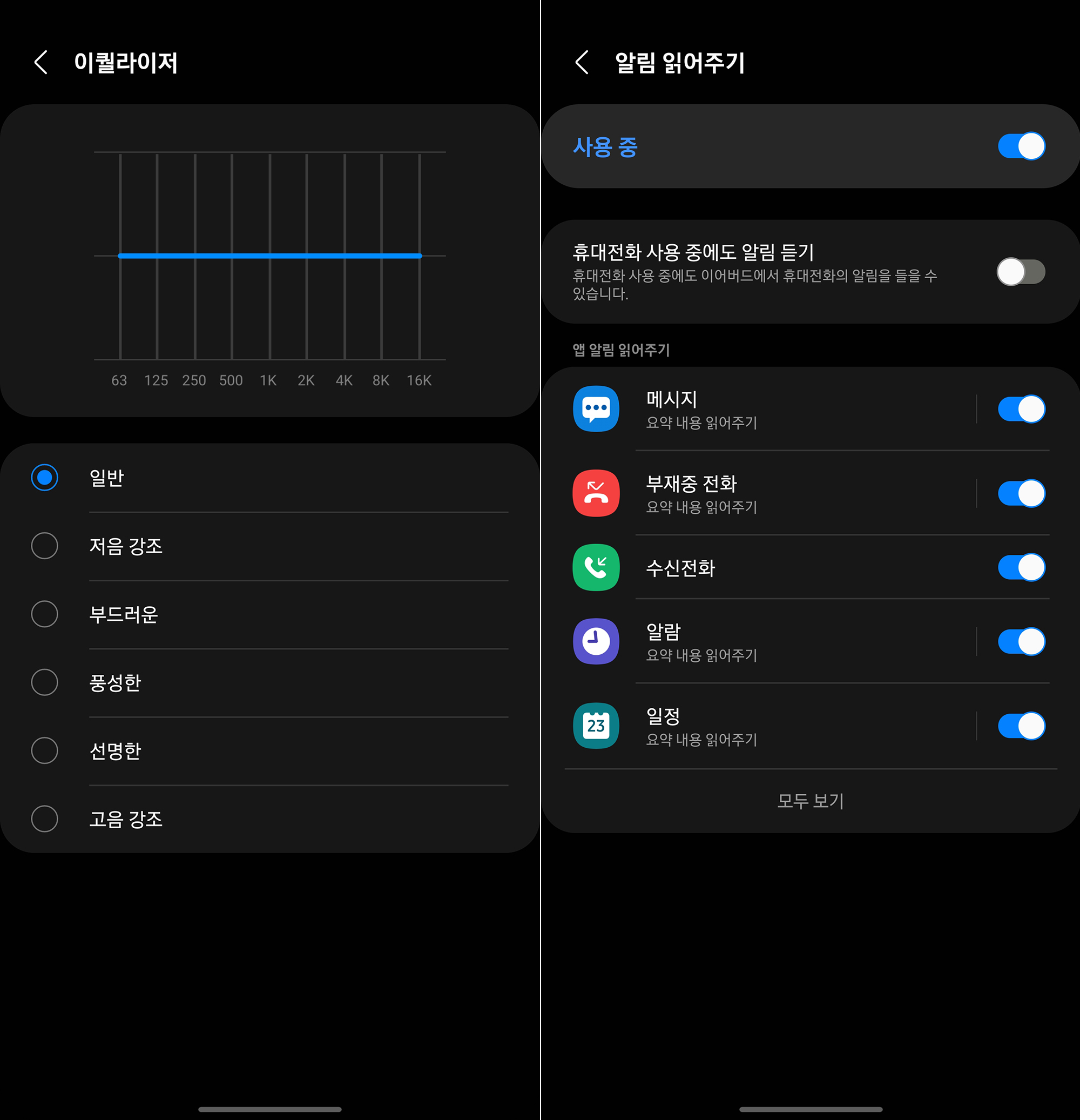 이퀄라이저 기능도 지원합니다. 저음 강조나 풍성한 고음 강조와 같은 프리셋들이 준비되어 취향에 따라서 활용해 주시길 바랍니다. 그리고 알림 읽어주기를 선택하면 스마트폰에서 알림이 발생했을 때 어떤 앱이 알림을 발생시켰는지 음성으로 확인할 수 있습니다. 그리고 모든 앱으로 기능을 확장할 수 있습니다.
