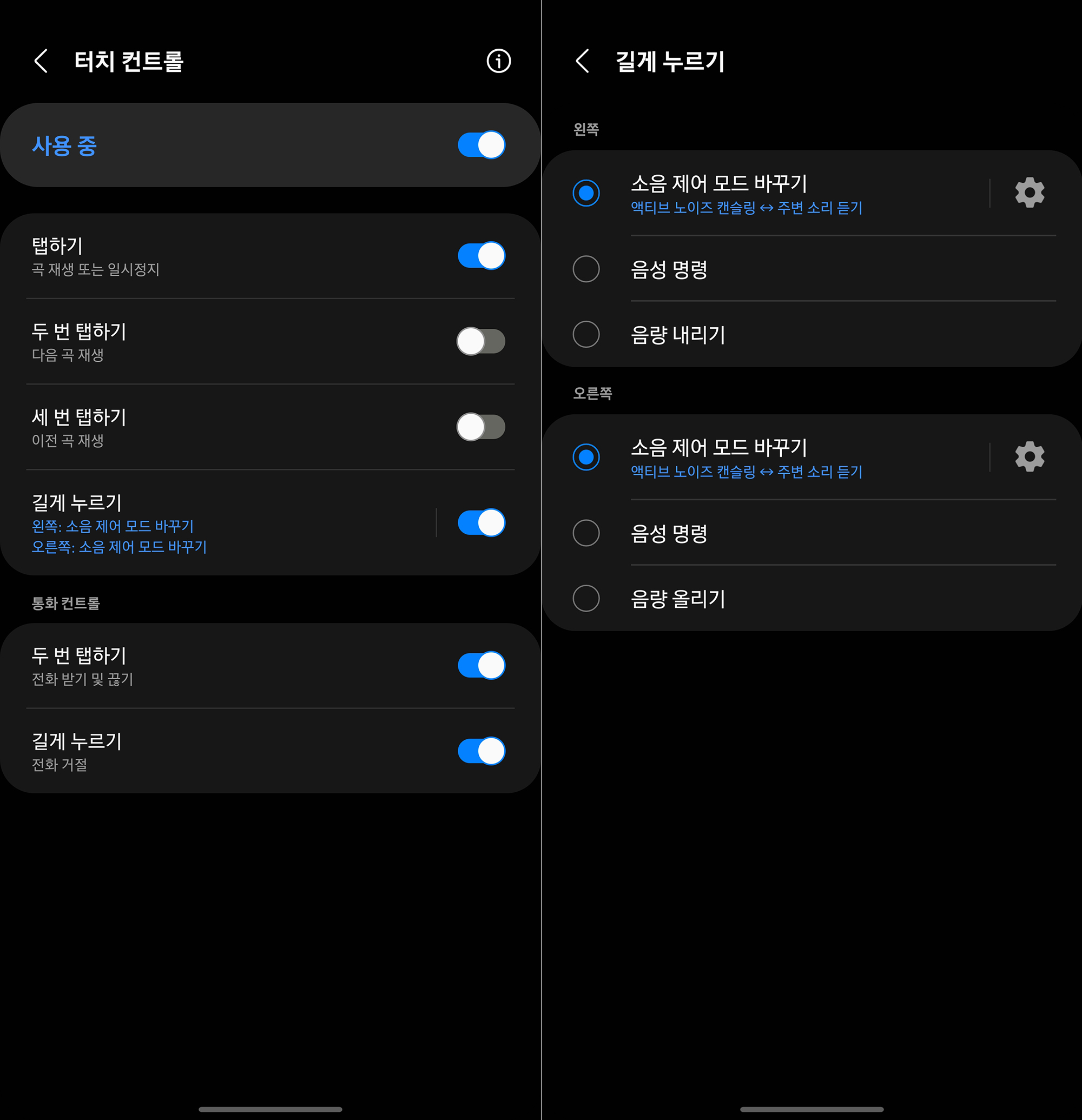 터치 컨트롤을 확인해 보면 한 번과 두 번 그리고 세 번, 길게 누르기 때문에 다르게 동작을 하고 길게 누르기 같은 경우에는 왼쪽과 오른쪽을 다르게 세팅할 수 있습니다. 필요에 따라서 활용해 주는 것이 좋을 것 같습니다.