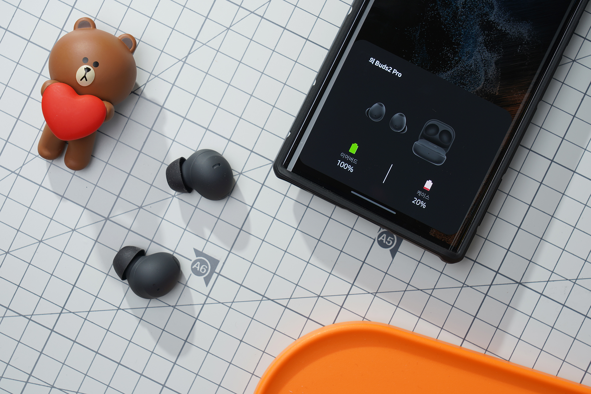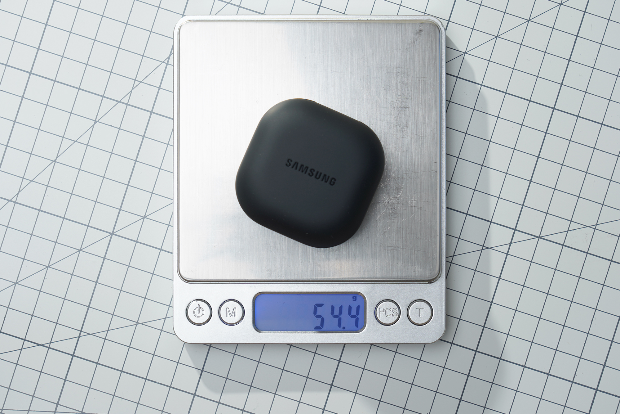 갤럭시 버즈2 프로의 이어버드가 수납된 충전 케이스의 무게는 약 54.4g으로 측정되었습니다. 케이스를 장착해서 사용한다고 해도 휴대하는데 크게 부담스러운 편은 아니라고 판단되었습니다.