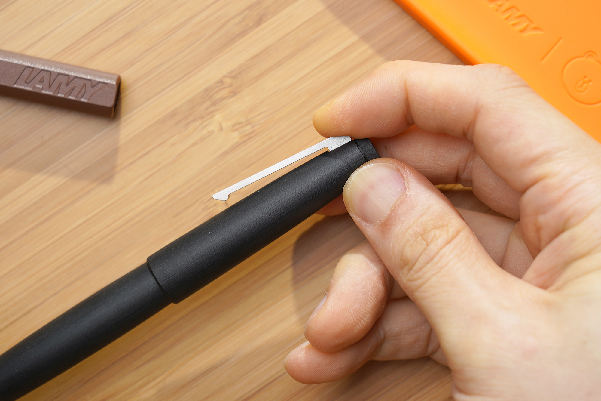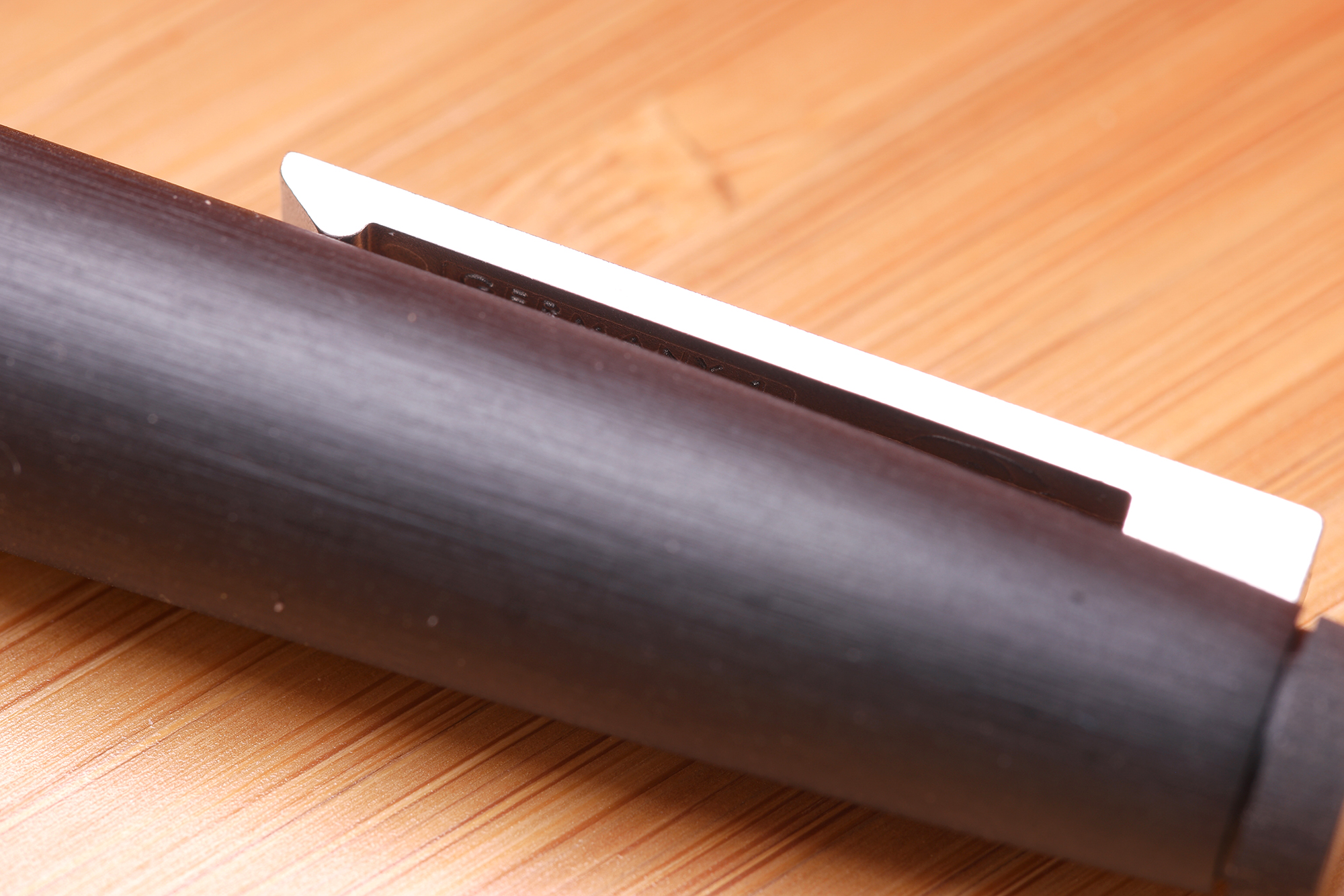 스테인리스 스틸 클립을 자세하게 살펴보면 옆쪽에 LAMY 로고가 인그레이빙되어 있는 것을 확인할 수 있습니다. 그리고 클립의 내부에도 디테일이 숨어 있는데요. 잘 보이지는 않지만 GERMANY라는 문구가 각인되어 있습니다. 참고로 라미 2000 마크롤론 만년필은 독일에서 제작이 되었습니다.