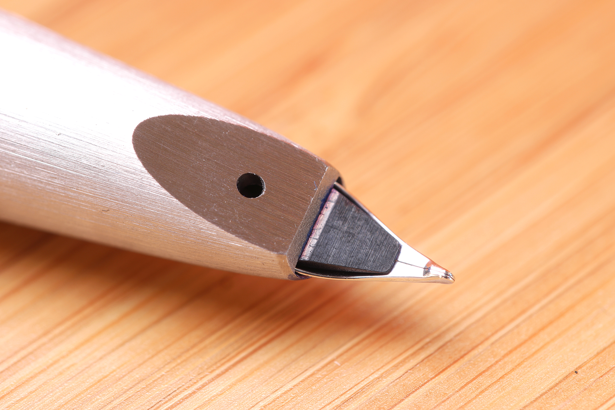 닙의 아래쪽을 살펴보면 세련된 형태로 스테인리스 스틸 그립부가 깎여 있고 중앙에 공기 유입을 위한 홀이 준비되어 있습니다. 기능적인 측면에서도 완성도가 높은 편입니다.