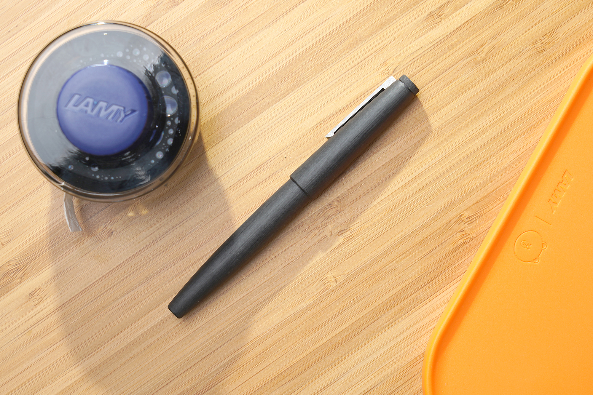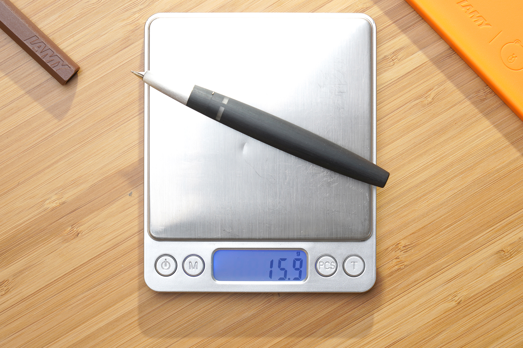 라미 2000 마크롤론 만년필의 무게는 24.8g이고 캡을 제거하면 15.9g입니다. (잉크를 넣지 않은 상태에서 측정했습니다.) 일반적으로 사용하는 볼펜들과 비교하면 무겁지만 실제로 사용해 보면 밸런스가 좋은 편이어서 크게 부담이 된다는 느낌은 없었습니다.