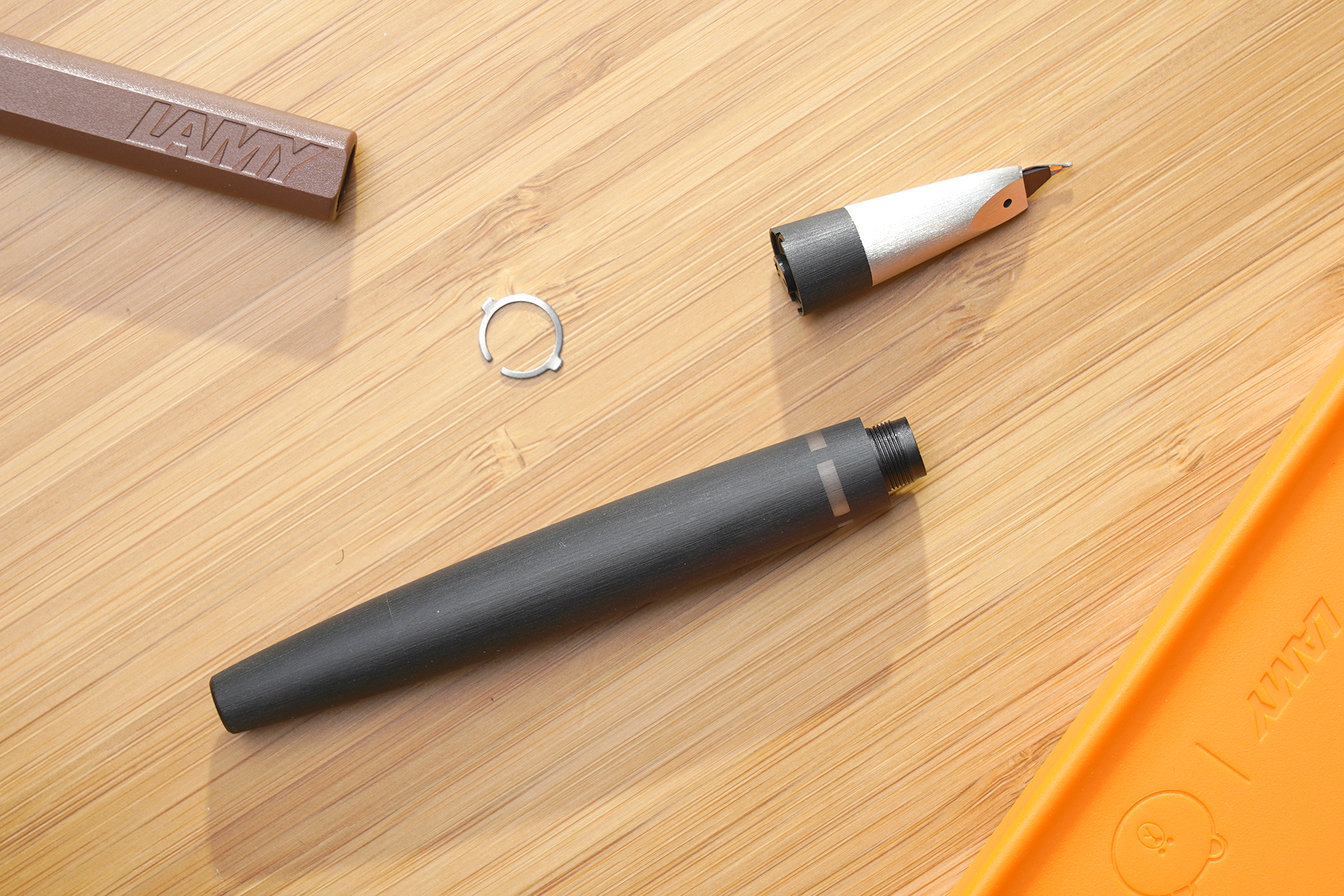 라미 2000 마크롤론 만년필은 피스톤 필러 방식으로 제작되었지만 편리하게 청소를 할 수 있도록 분리를 할 수 있습니다. 그리고 내부에는 메탈링이 장착되어 있는데요. 잃어버리지 않도록 주의해주는 것이 좋습니다. 그리고 가능하면 만년필은 분해하지 않는 것이 좋습니다.