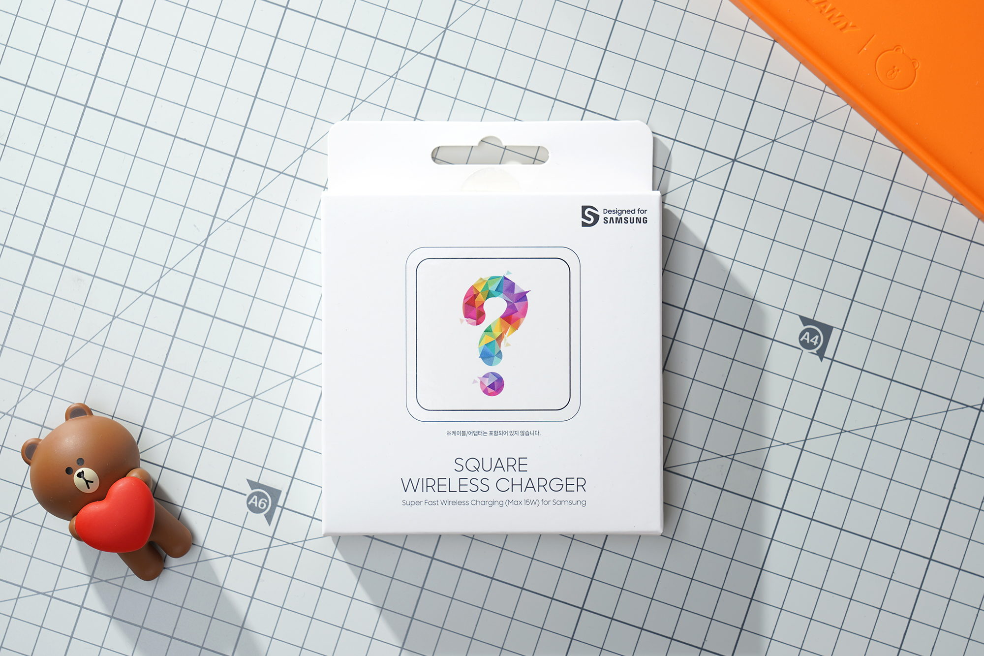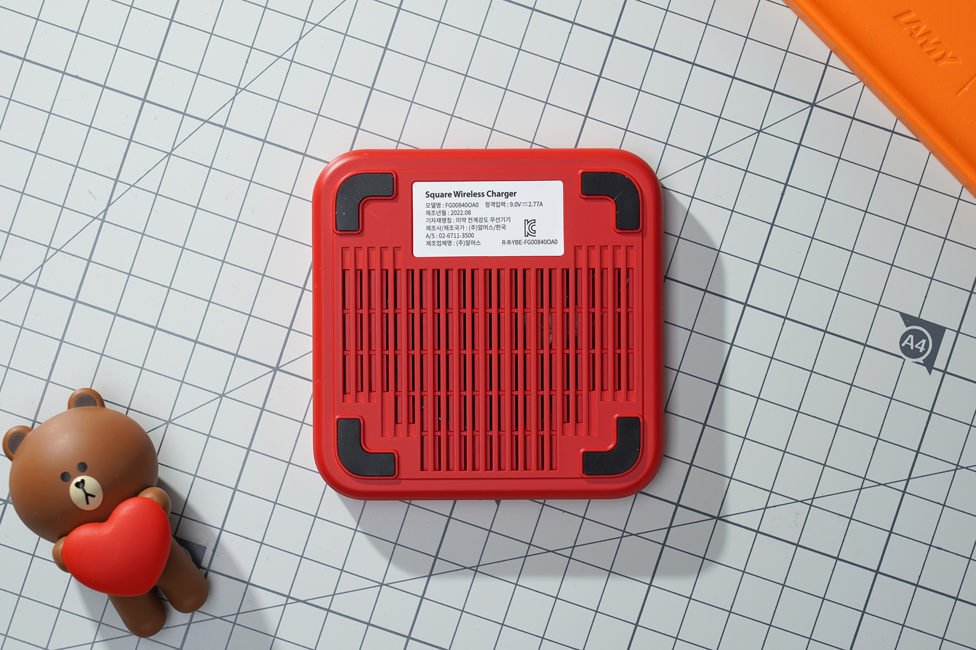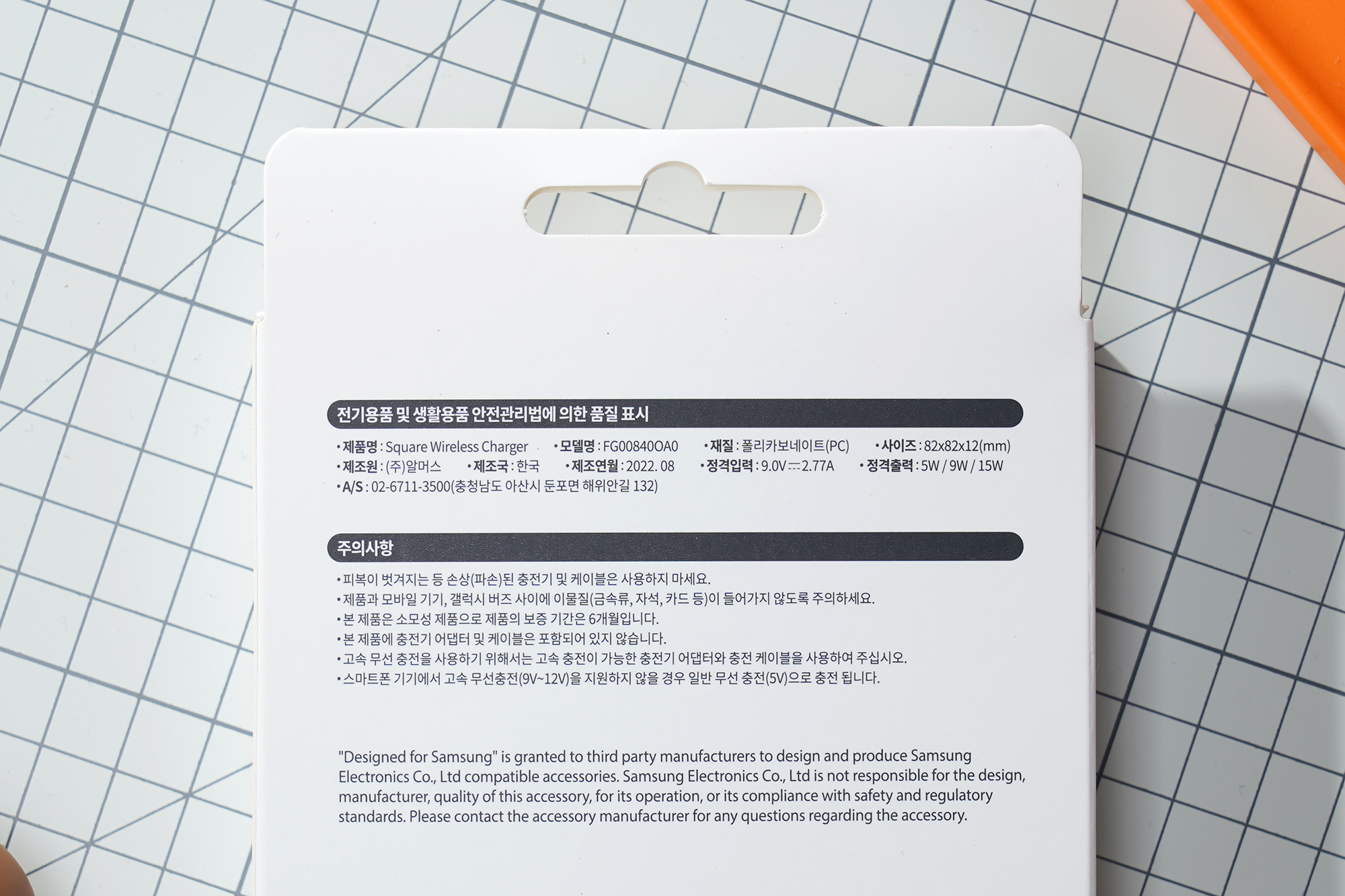박스의 뒤쪽을 살펴보면 특징이 설명되어 있습니다. 제품명은 Square Wireless Charger이고 모델명은 FG00840OA0입니다. 그리고 재질은 폴리카보네이트(PC)이고 알머스라는 회사에서 제조한 것을 확인할 수 있습니다.