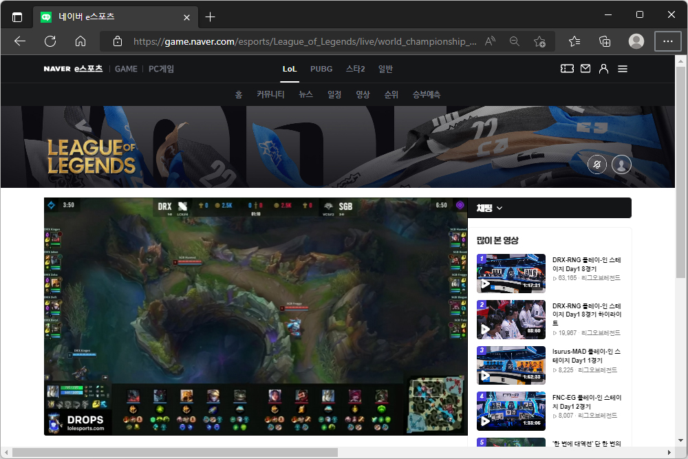 우선 아래쪽의 네이버 링크를 선택하면 바로 1080p 해상도의 롤드컵 2022 라이브 영상을 시청할 수 있습니다. 특히 별도로 그리드 소프트웨어를 설치하지 않고도 시청할 수 있다는 점이 편리한 부분이라고 할 수 있습니다.