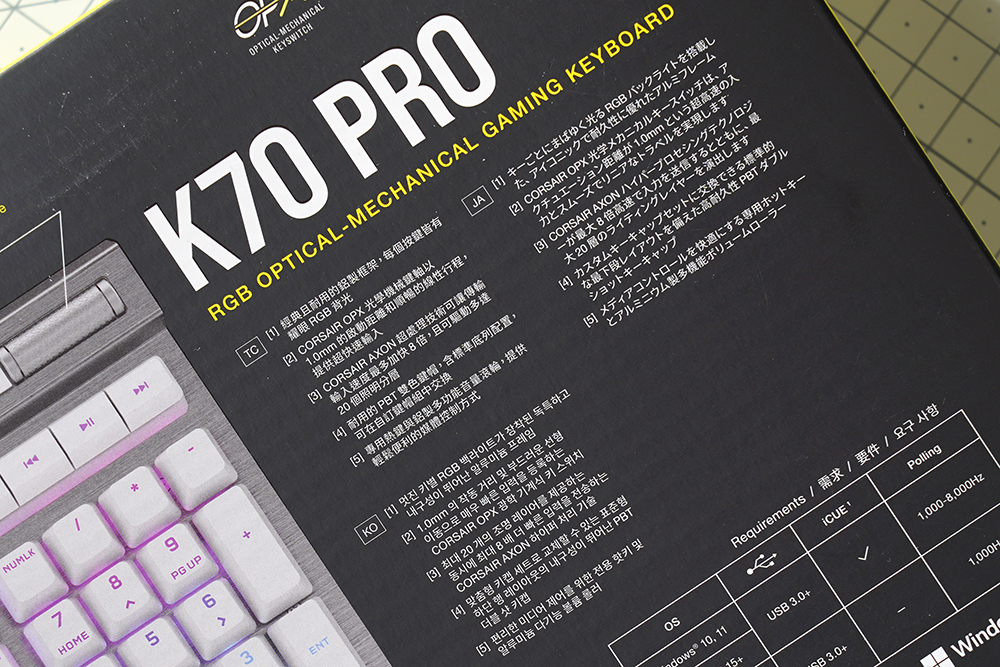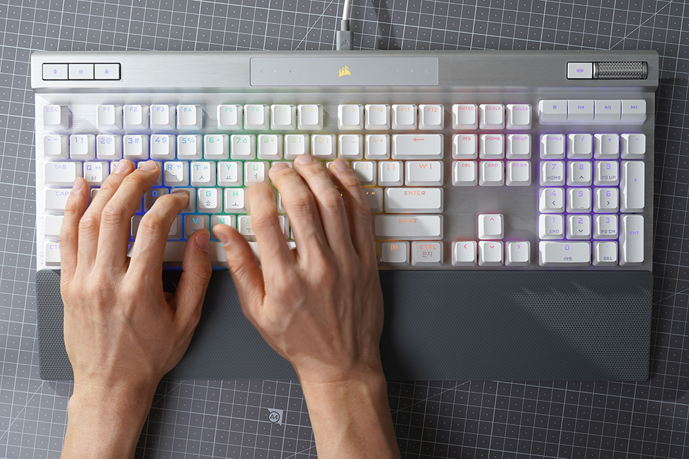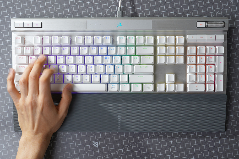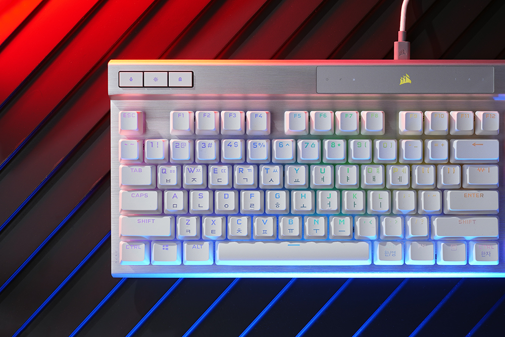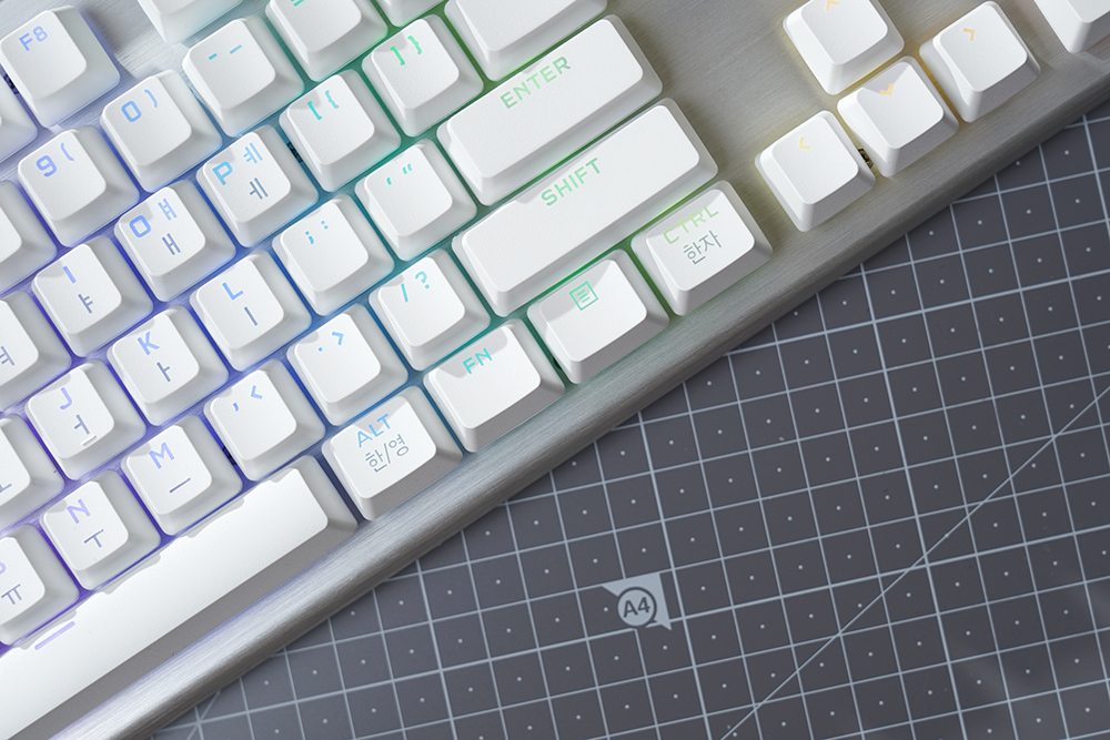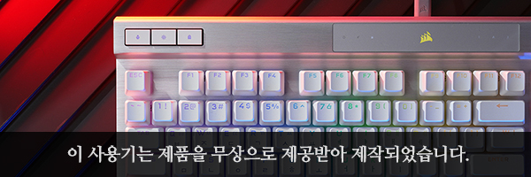 커세어(CORSAIR) K70 RGB PRO OPX에는 1.0mm 작동 거리를 가진 CORSAIR OPX 광학 기계식 키 스위치가 탑재되었습니다. 특히 적외선 방식으로 동작하기 때문에 디바운스 지연이 발생하지 않고 빠른 키 누름 등록이 보장됩니다. 그리고 RGB LED는 위쪽에 배치되어 있어서 한국어 부분의 조명은 조금 약한 편입니다.