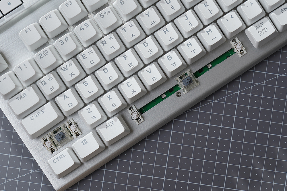 커세어(CORSAIR) K70 RGB PRO OPX에는 체리식 스테빌라이저가 적용되었습니다. 윤활이 최소화되어 있는 형태이기 때문에 소음이 거슬리시는 분들은 별도로 윤활 처리를 해주어도 좋습니다.
