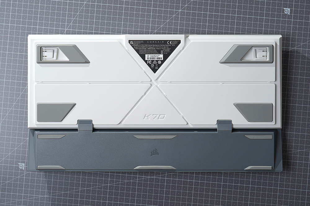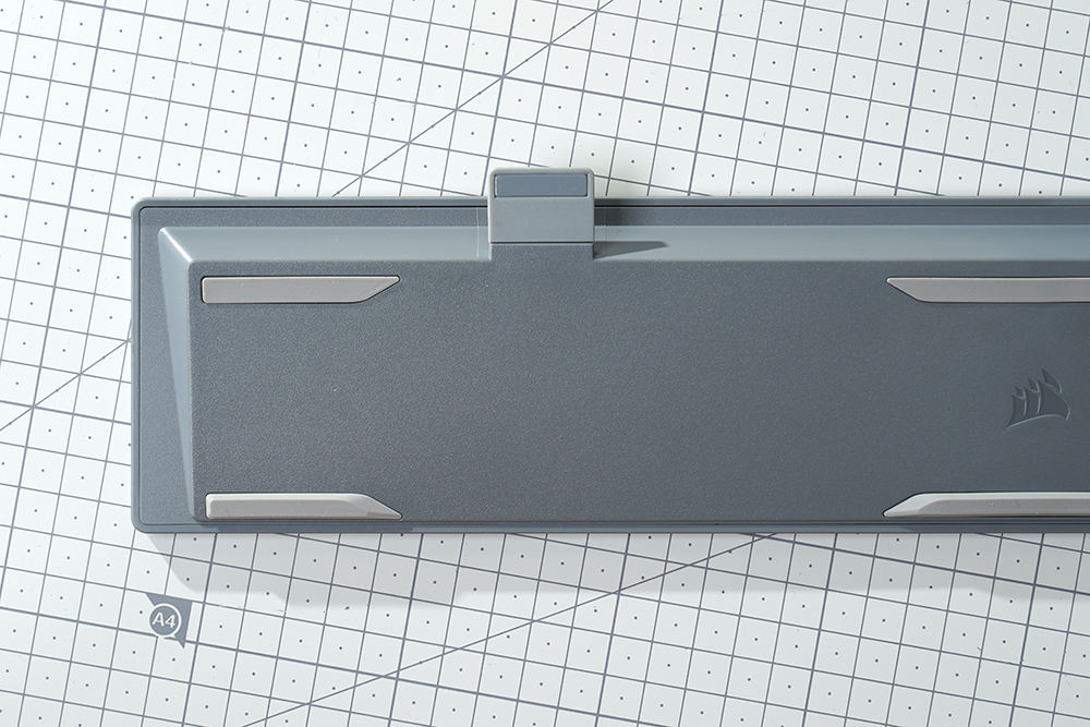 커세어(CORSAIR) K70 RGB PRO OPX의 바닥을 살펴보면 모서리 부분에 커다란 형태의 고무 지지대가 배치되어 있어서 책상 위에서 잘 미끄러지지 않도록 설계되었습니다.