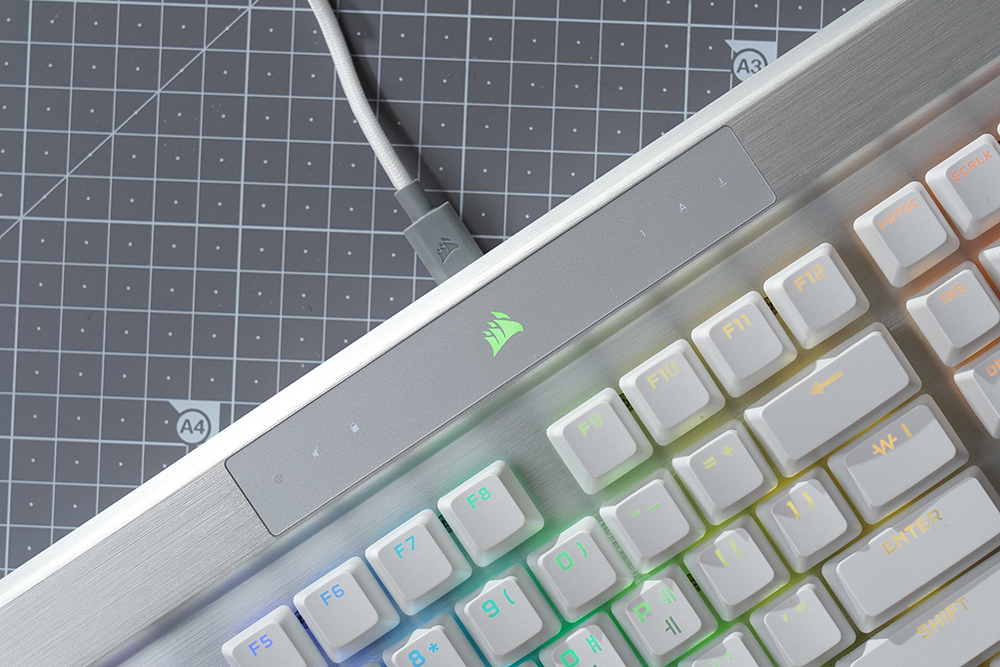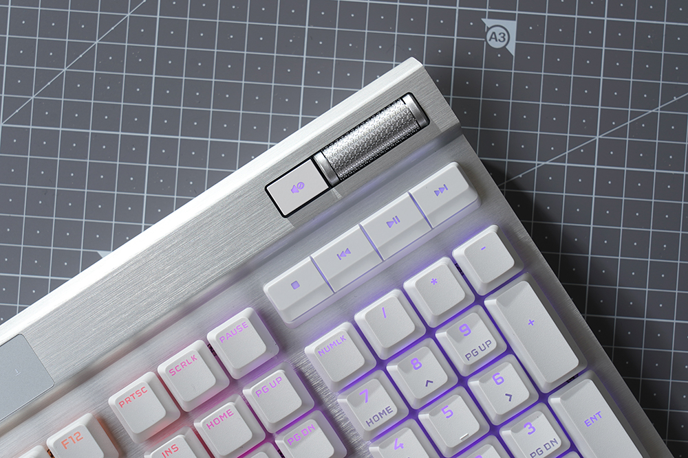 오른쪽에는 볼륨을 조절할 수 있는 CORSAIR 시그니처 알루미늄 룰러와 음소거 버튼 그리고 멀티미디어 키들이 배치되어 있습니다. 게임을 플레이하면서 유튜브를 시청하거나 음악을 듣는 분들에게 유용한 기능들이라고 할 수 있습니다.