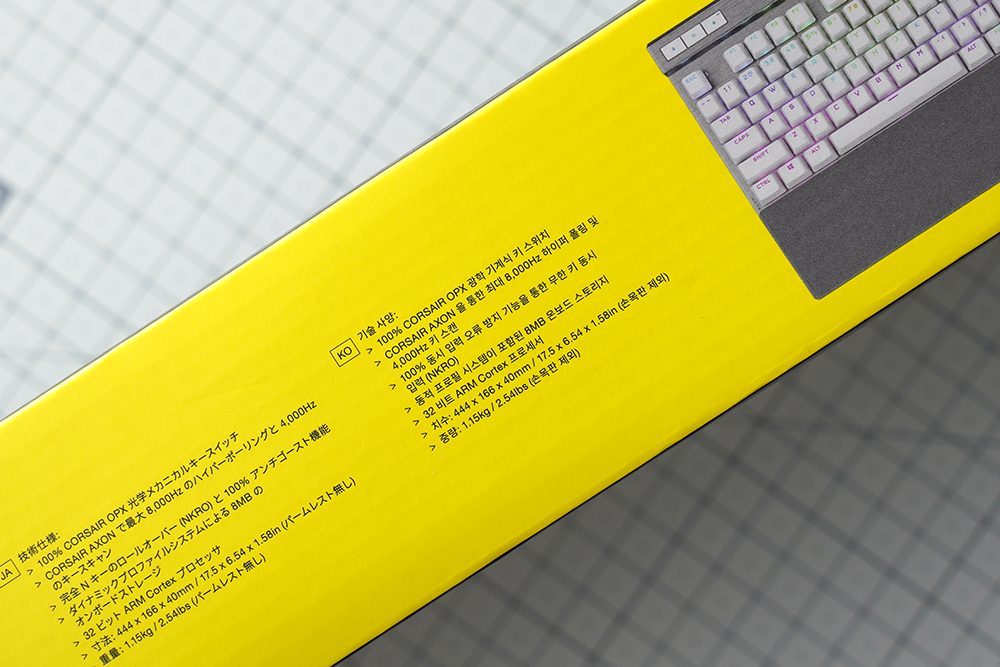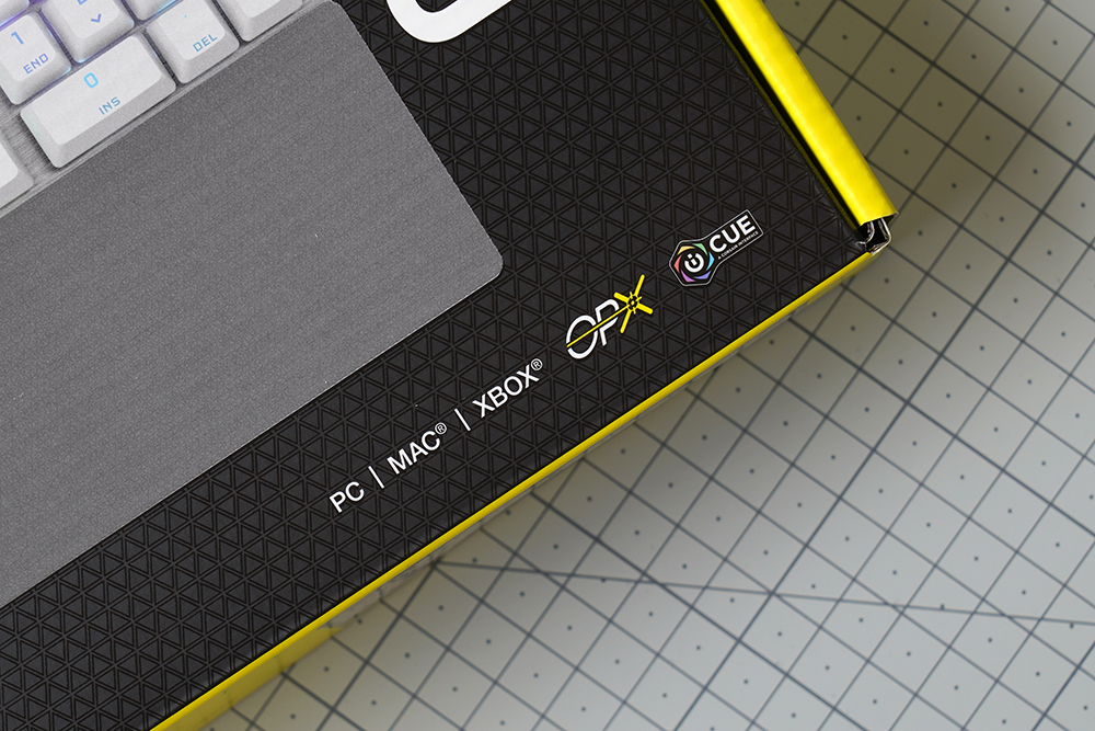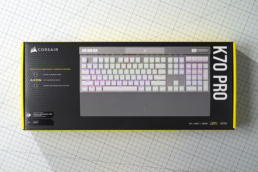 커세어(CORSAIR) K70 RGB PRO OPX의 박스는 블랙과 커세어를 상징하는 노란색으로 제작되었는데요. 세련된 느낌을 주는 편입니다. 특히 삼각형 형태의 패턴들이 표면에 인쇄되어 있다는 점이 디자인의 완성도를 높여주는 요소라고 생각되었습니다.